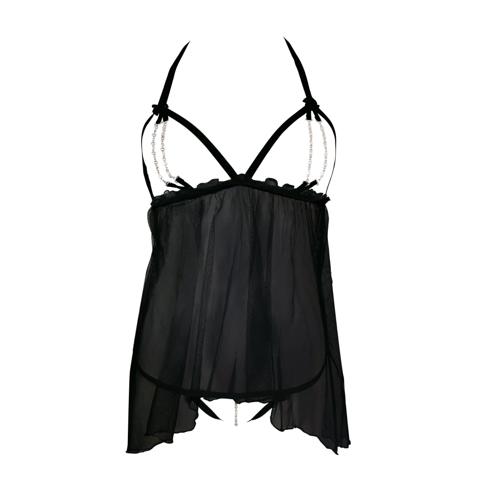 Babydoll sexy confectionat din voal transparent, ale carui cupe sunt complet deschise, realizate din benzi elastice si lantisoare cu strasuri. Include un slip asortat ce lasa la vedere zona intima si fesele.