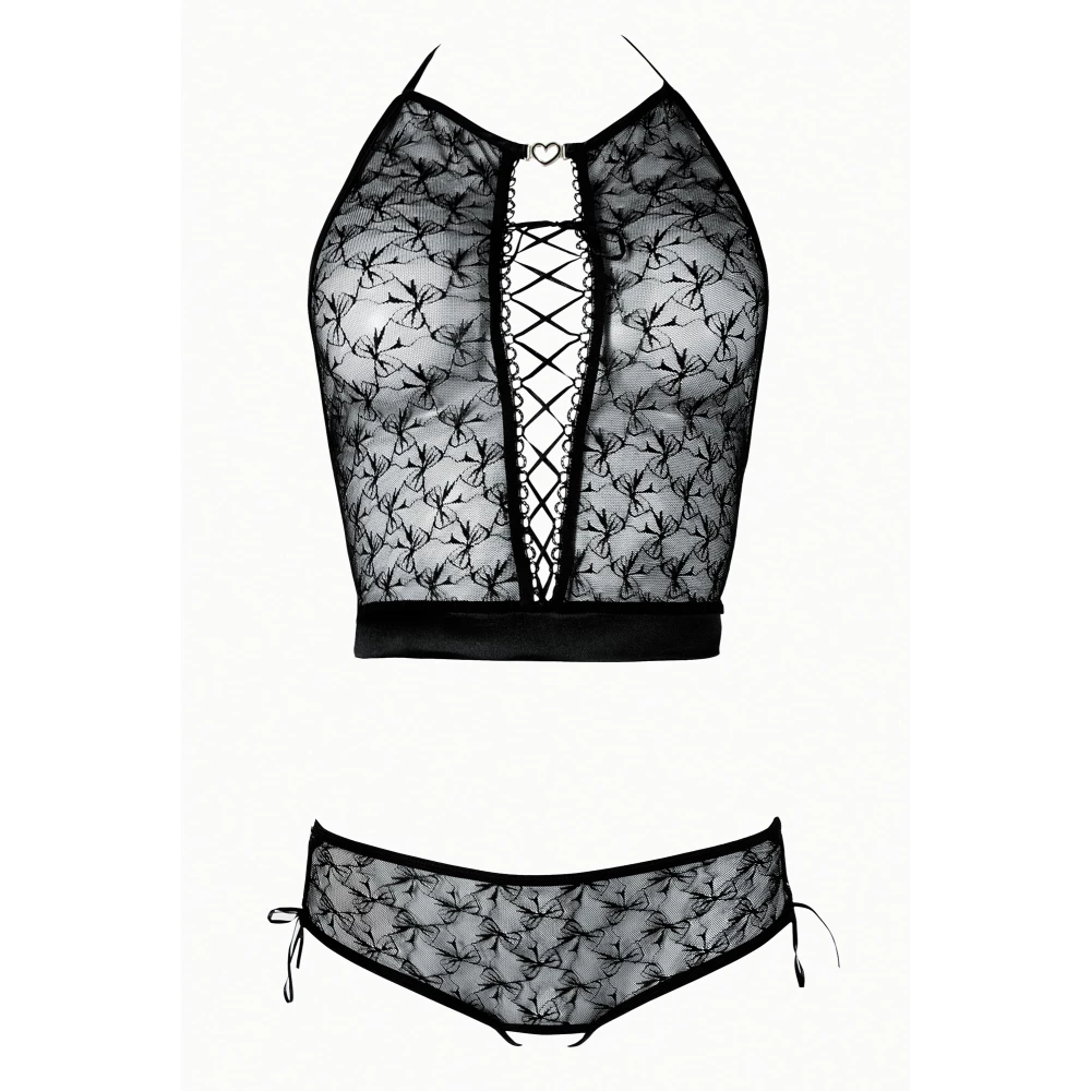 Set sexy confectionat din material transparent, dantelat, alcatuit din top cu prindere dupa gat si boxeri decupati in zona intima. Impletiturile cu banda satinata din zona decolteului si de pe solduri condimenteaza intregul design, facandu-l tentant si senzual.