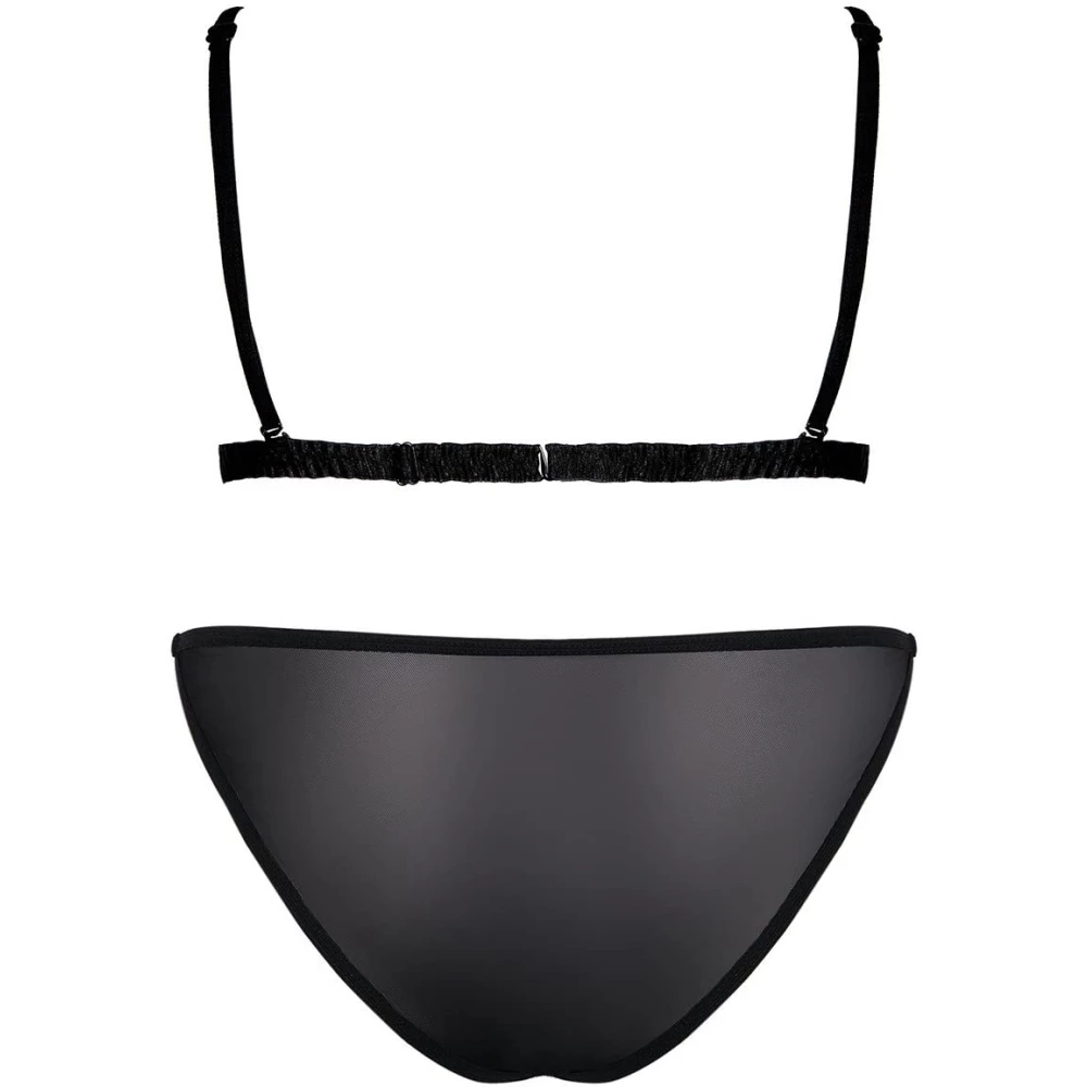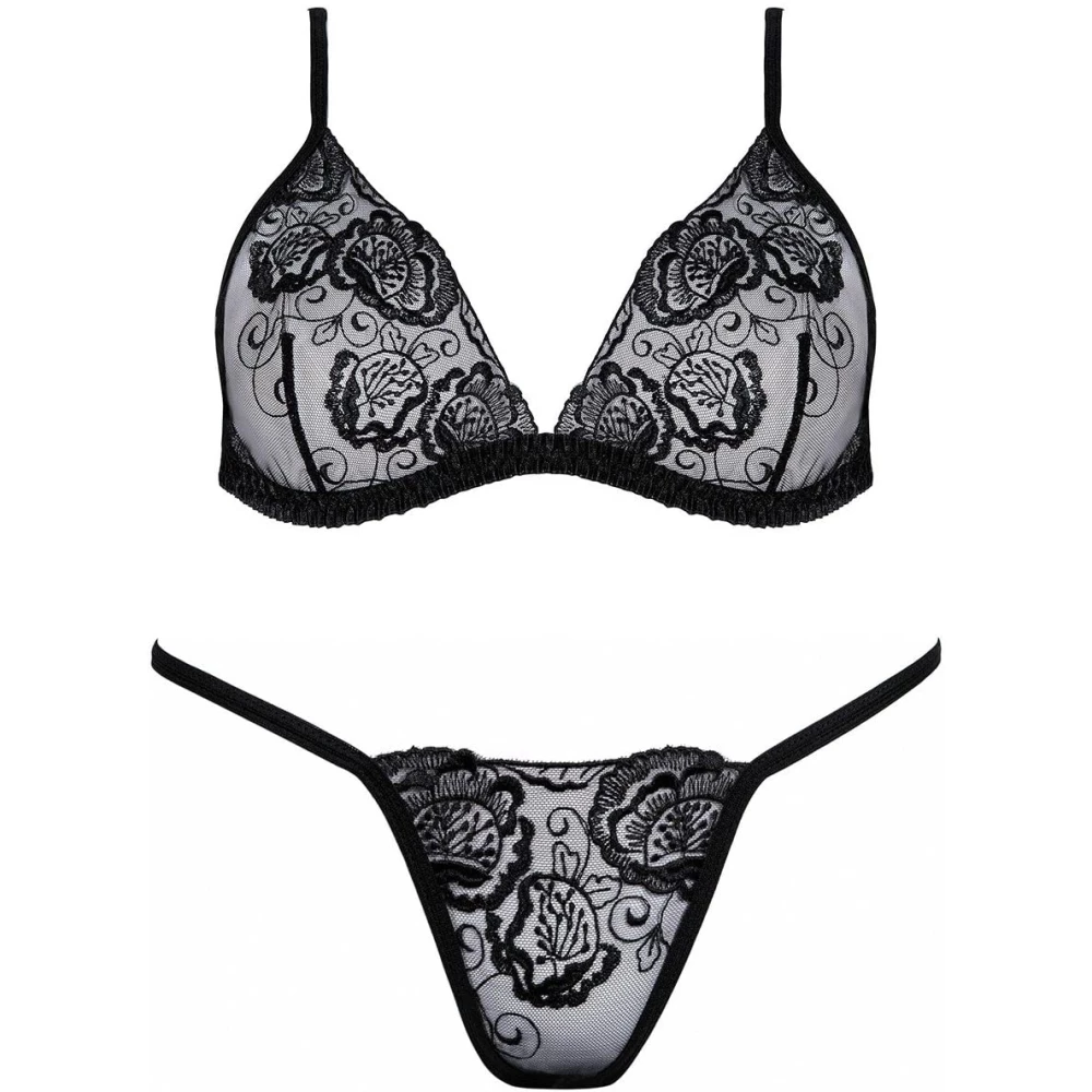 Set de lenjerie sexy alcatuit din sutien si slip, confectionat din dantela cu model floral si benzi elastice reglabile.