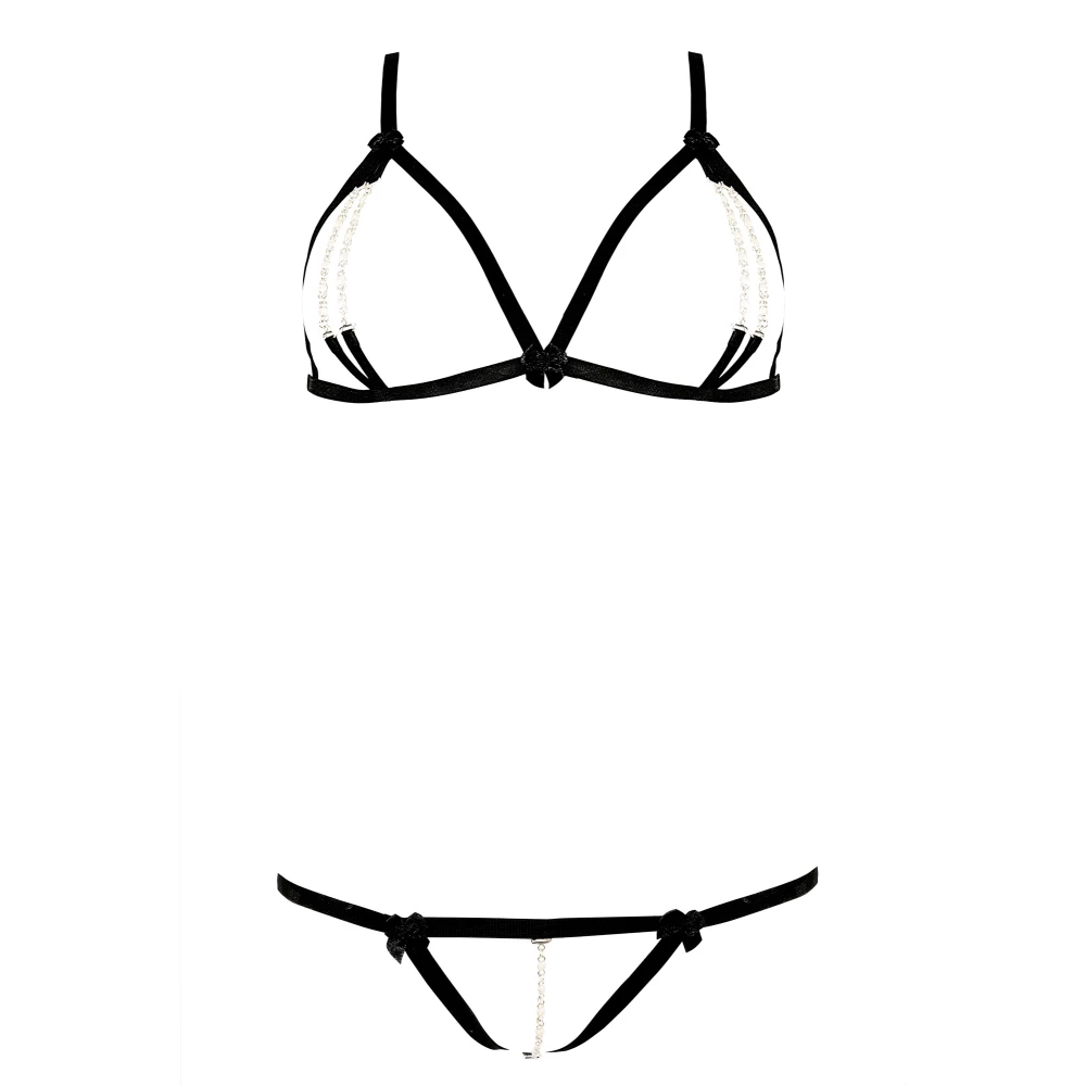 Set sexy alcatuit din sutien si slip tanga, confectionat din benzi elastice si decorat cu fundite din satin si lantisoare cu strasuri.