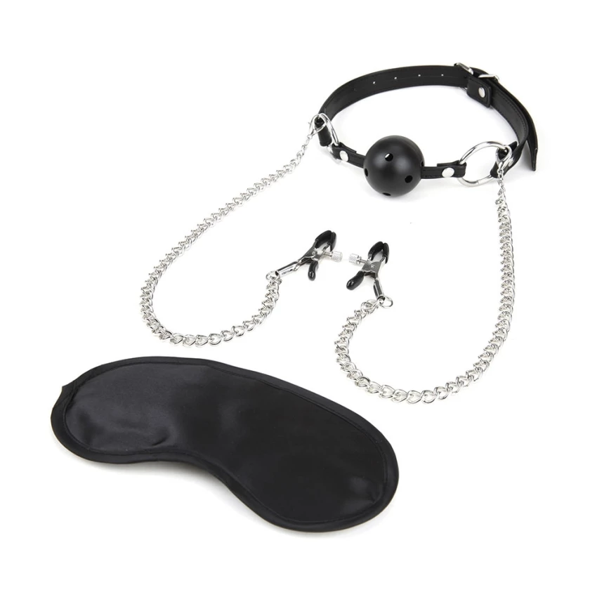 Set de accesorii, compus din bila pentru gura, cu orificii ce faciliteaza respiratul, reglabila, conectata printr-un lant de un set de cleme pentru sfarcuri.