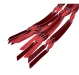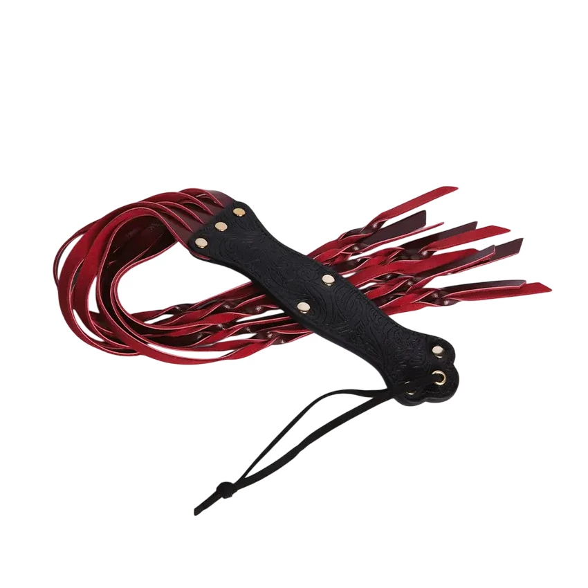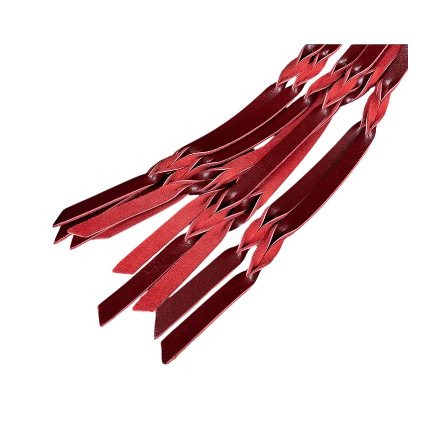 Cozile biciului pleaca din zona manerului intr-un stil clasic, urmand ca din mijloc pana spre capat sa se continue cu un model seducator impletit. Acest aspect alaturi de modelul geometric si niturile stil capse fixe aurii prezente pe maner, intregesc imaginea unui articol fetish remarcabil de exceptie.