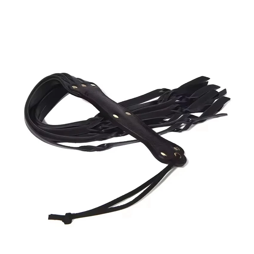 Cozile biciului pleaca din zona manerului intr-un stil clasic, urmand ca din mijloc pana spre capat sa se continue cu un model seducator impletit. Acest aspect alaturi de modelul geometric si niturile stil capse fixe aurii prezente pe maner, intregesc imaginea unui articol fetish remarcabil de exceptie.