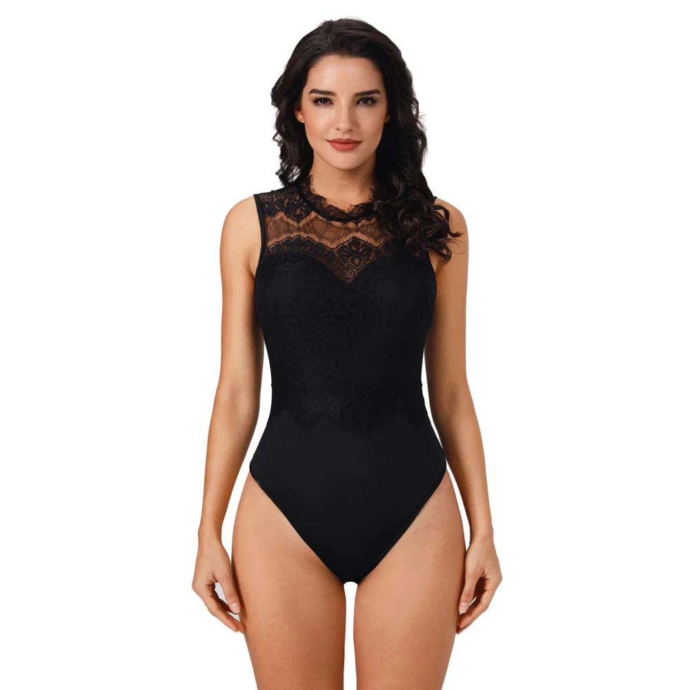 Body de culoare neagra, prevazut cu broderie florala in zona bustului, sistem de inchidere la baza gatului si model decupat la spate.