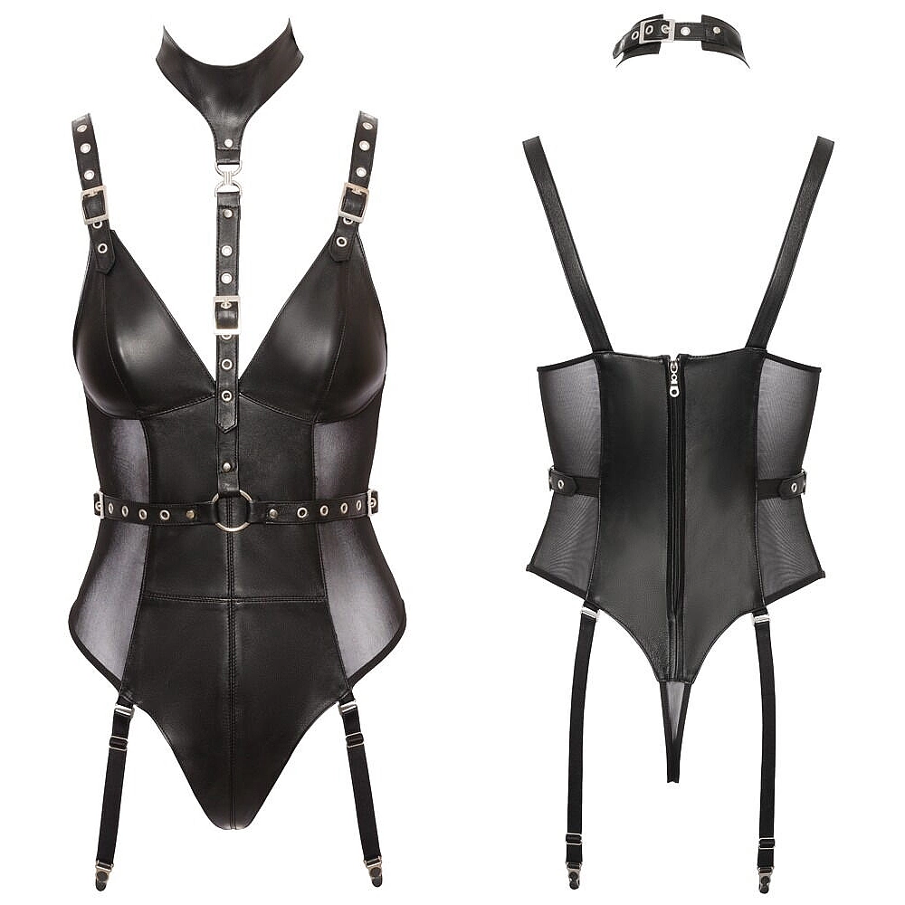 Lenjerie fetish cu design incitant si atragator, realizat sub forma de body versatil din mixuri de materiale fine si placute la atingere. In zona din fata, body-ul este realizat din piele naturala, ceea ce ofera produsului o nota de calitate si eleganta. In laterale, materialul este tip tulle transparent care se muleaza pe corp intr-un mod senzual.