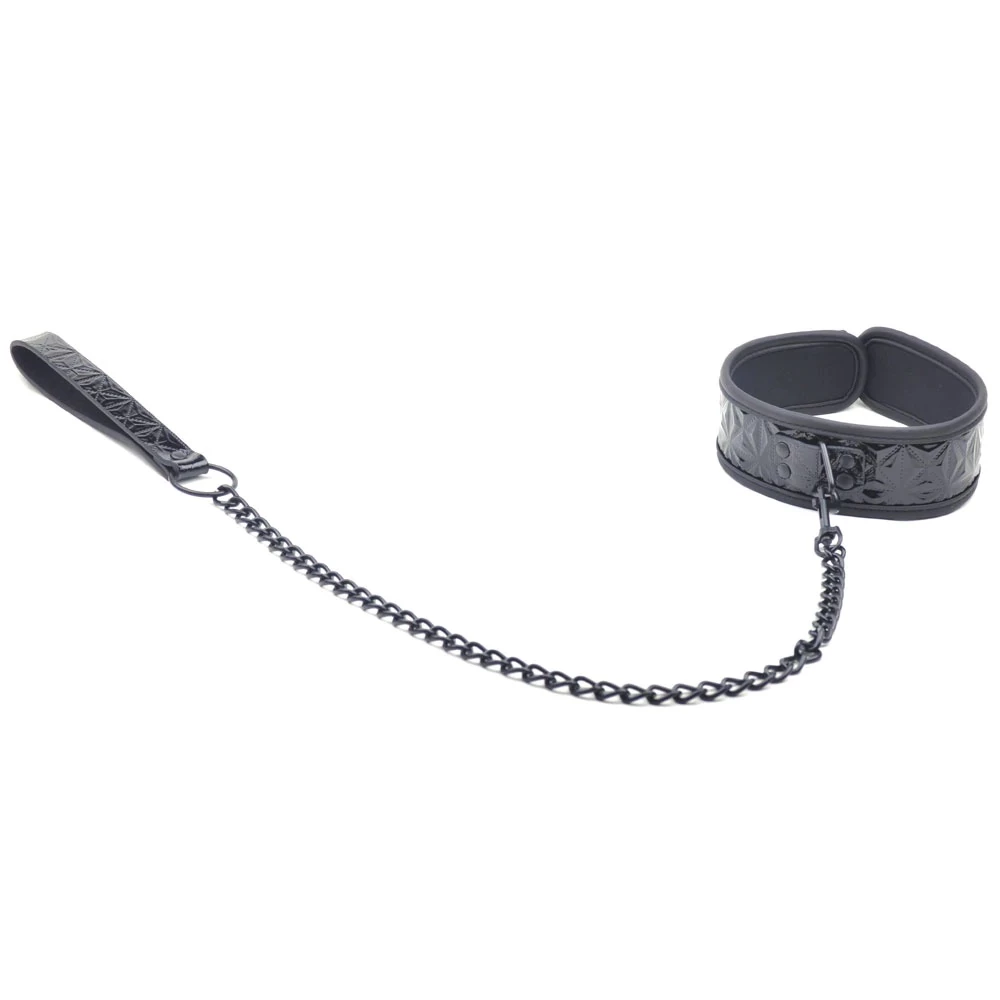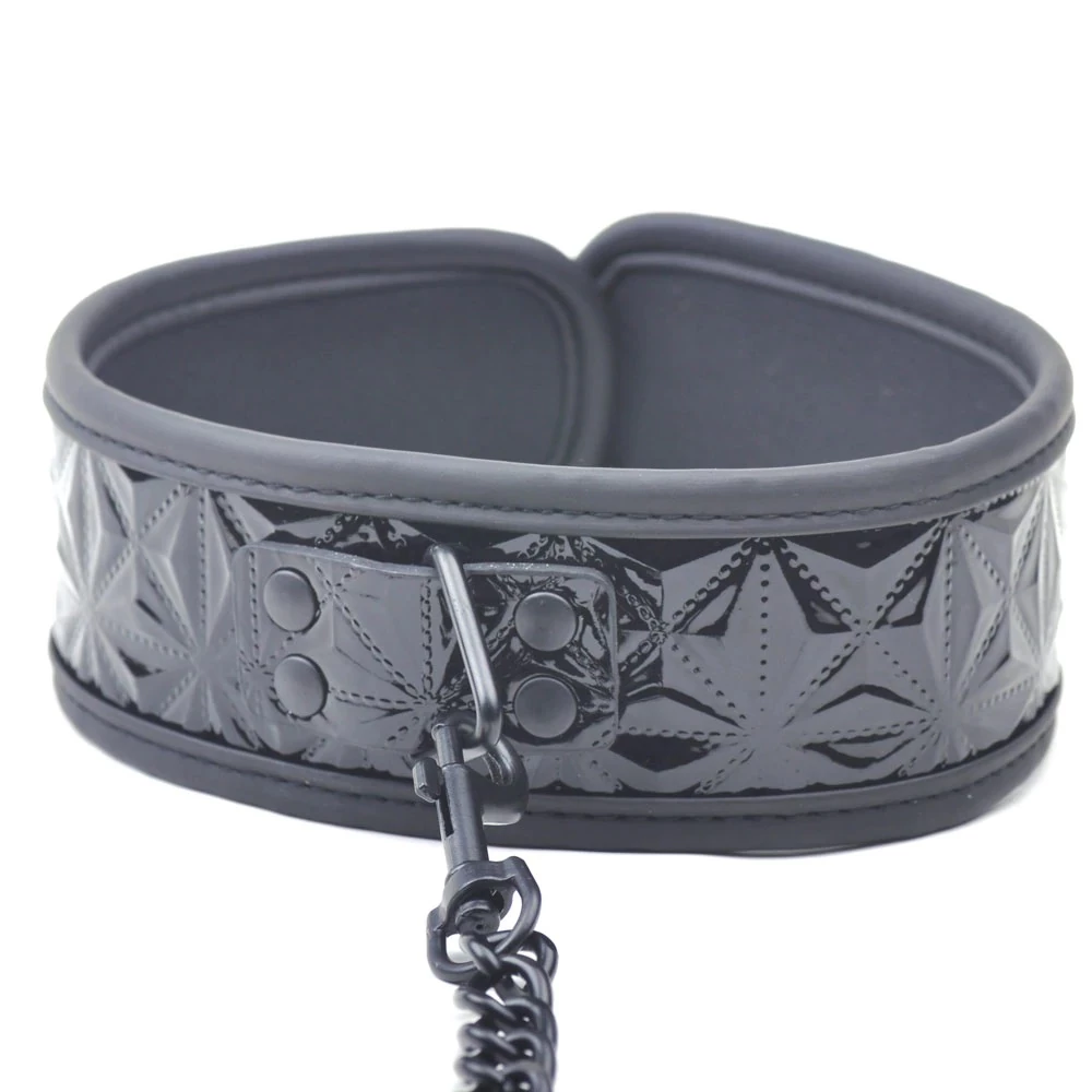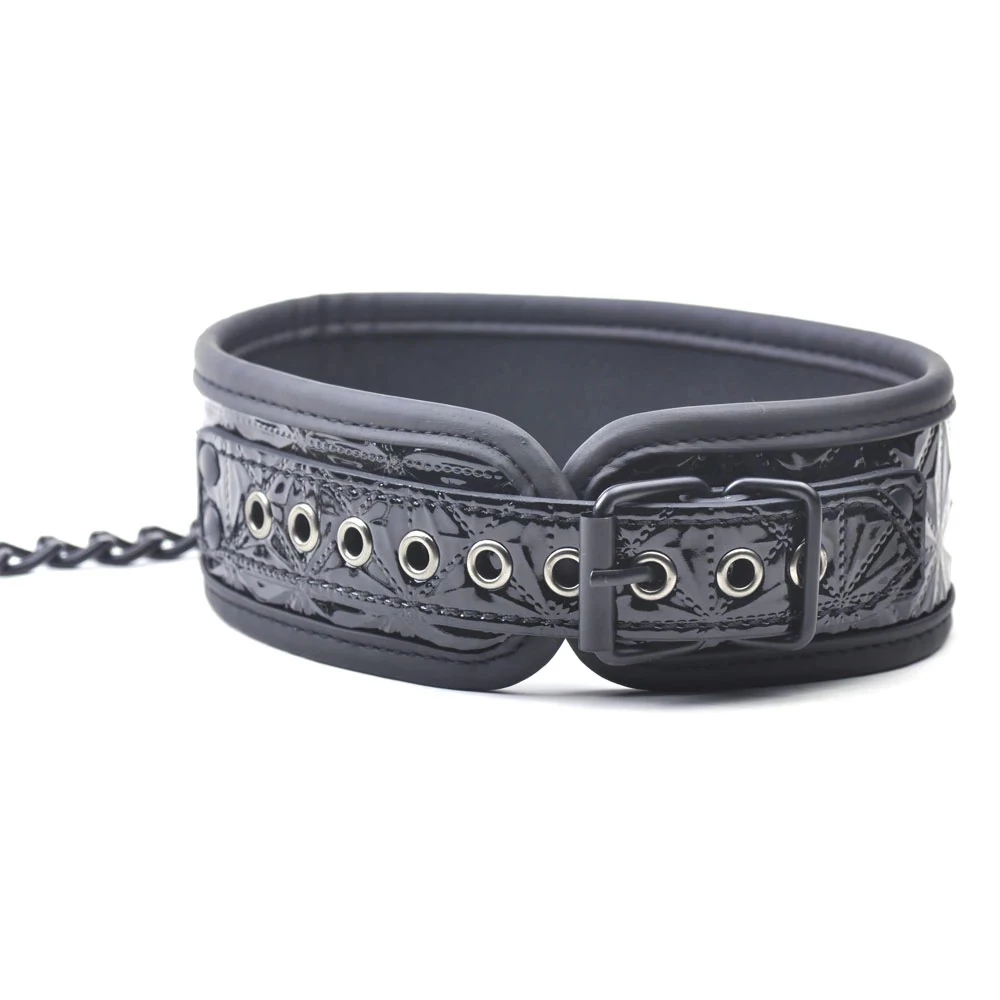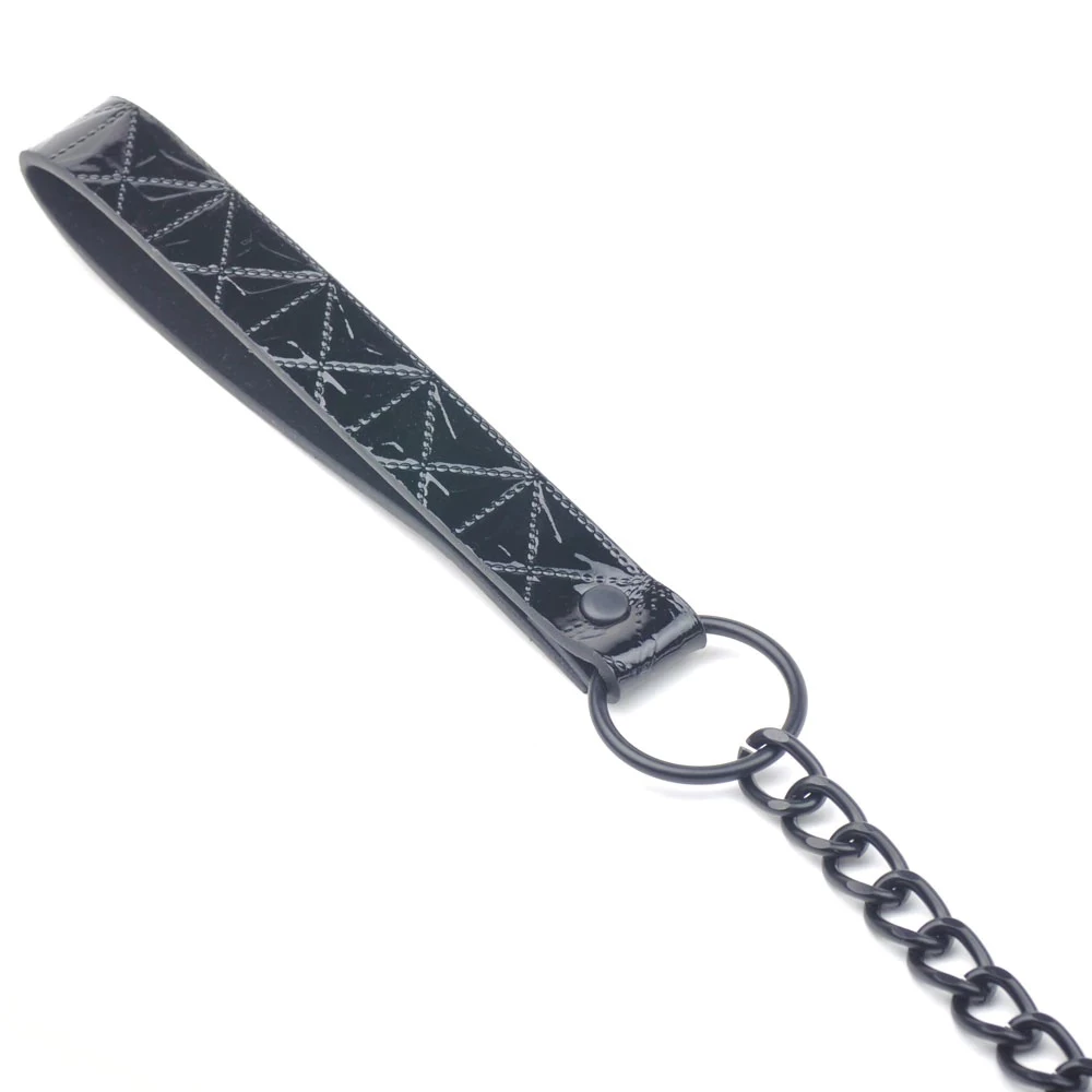 Zgarda pentru jocurile BDSM. Este confectionata din piele ecologica cu aspect lacuit si este prevazuta cu lant metalic.