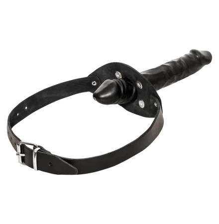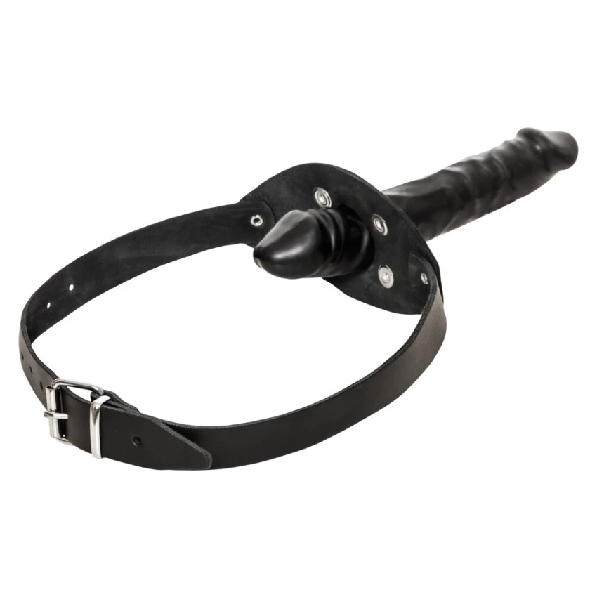 Calus sub forma de dildo dublu de culoare neagra, prevazut cu o curea reglabila ce este realizata din piele naturala extrem de fina si placuta la atingere. Cureaua dispune de capse argintii care fixeaza ansamblul cu dildo si de sistem cu catarama metalica care ajuta la ajustarea functie de circumferinta zonei capului fiecarei persoane.