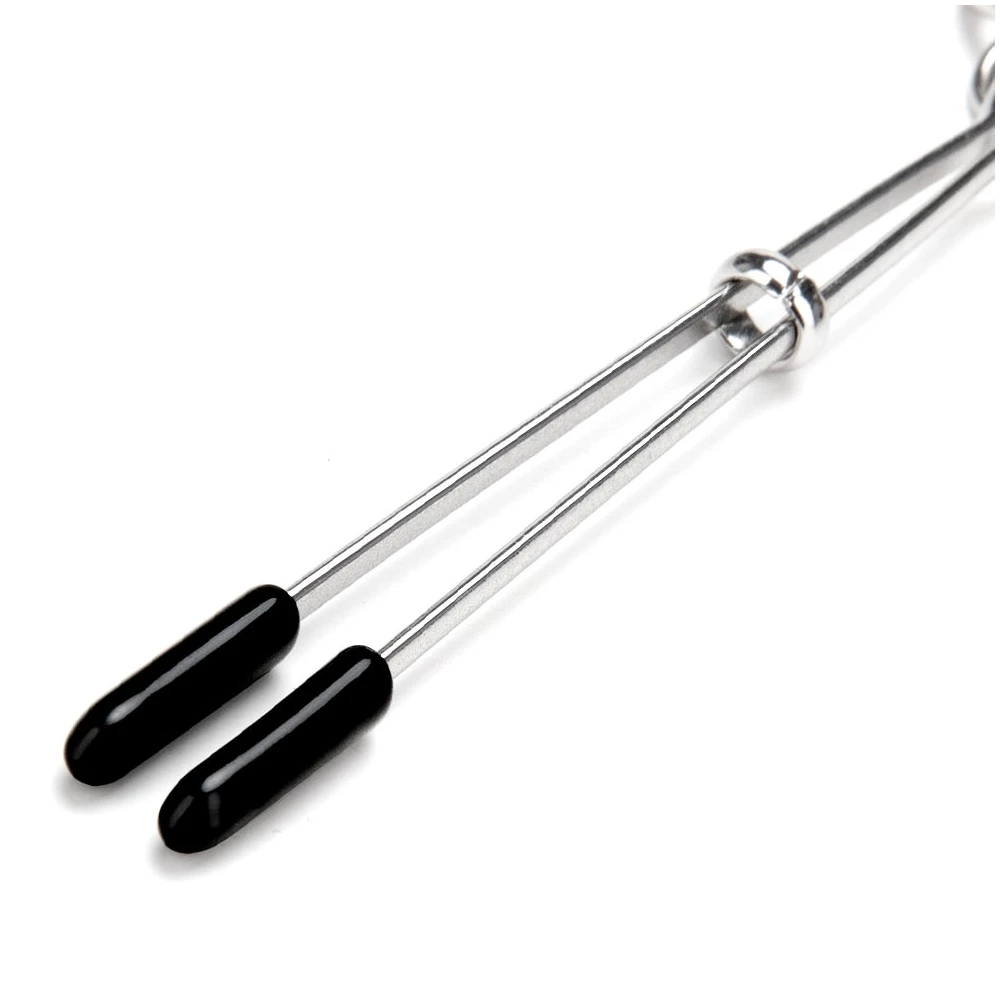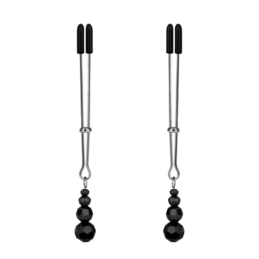 Cleme pentru sfarcuri cu design pensenta, usor de reglat. Sunt prevazute cu varfuri acoperite cu cauciuc, pentru a proteja pielea de orice durere. Perfecte pentru incepatori, clemele asigura confort iar margelutele, care atarna si tachineaza cand ating corpul, intensifica senzatiile.
