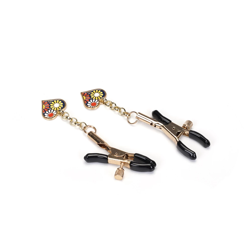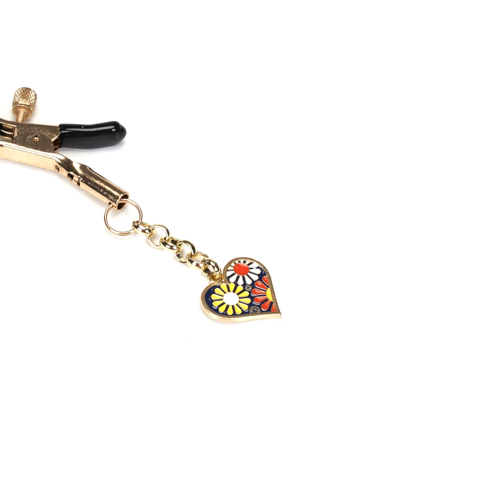 Cleme pentru sfarcuri prevazute cu lant si bijuterie in forma de inima. Inima este decorata cu flori.