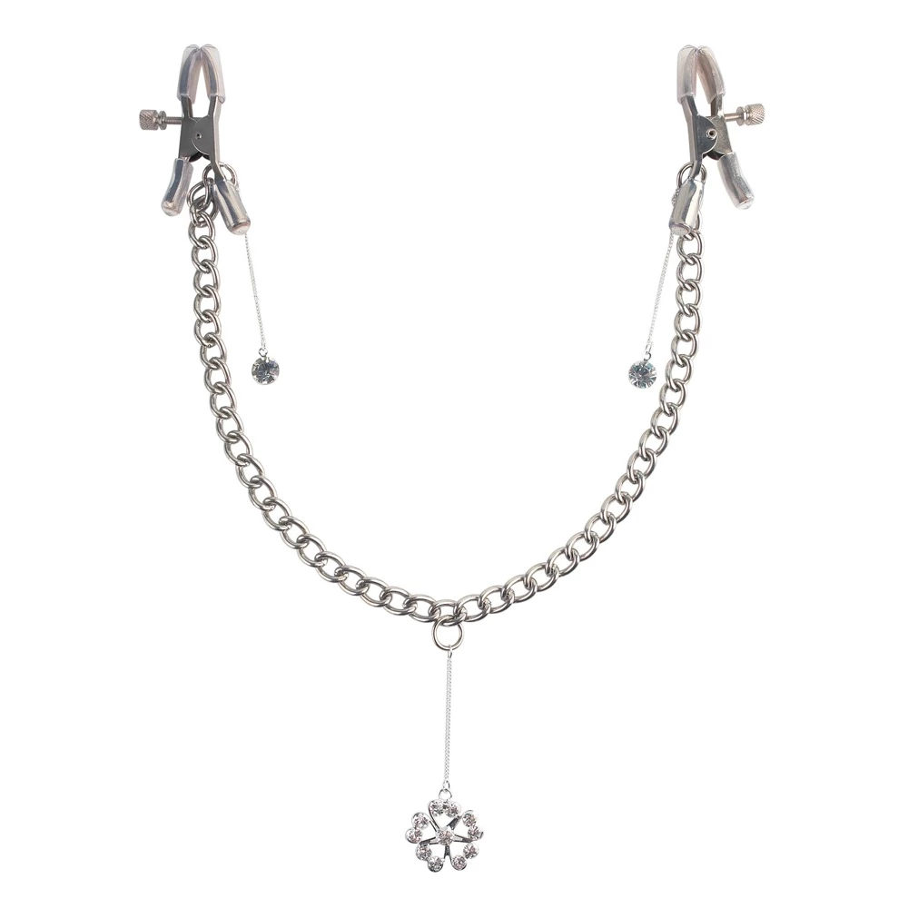 Cleme metalice pentru sfarcuri cu sistem de prindere pe baza de surub, unite intre ele printr-un lant cu lungimea de 38 cm, decorate cu pietricele.