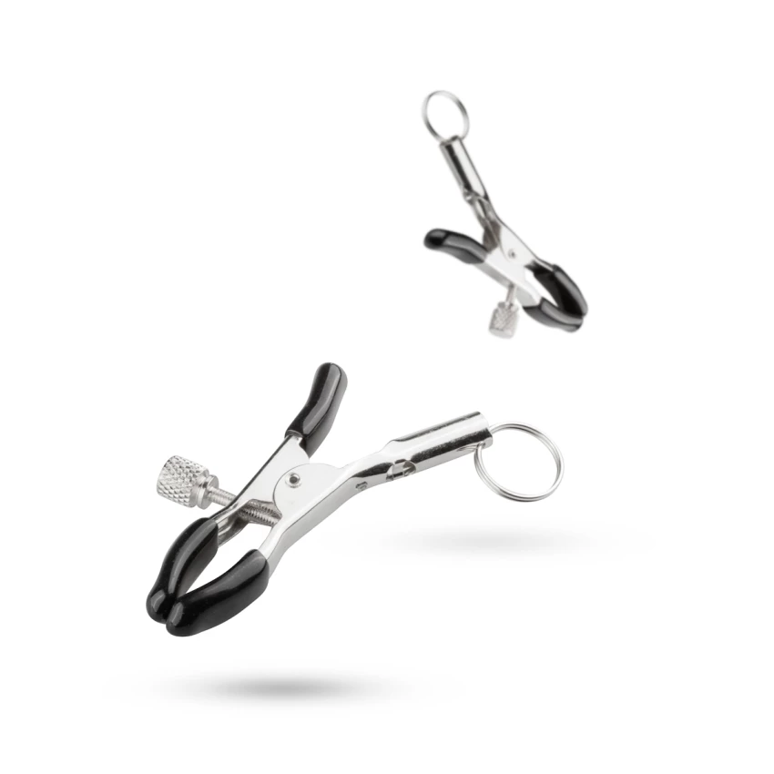 Accesorii fetish sub forma de cleme pentru sfarcuri, realizate intr-un design atractiv, de culoare argintie cu suprafata de prindere a sfarcurilor neagra. Produsul este unisex, astfel incat se poate folosi atat de catre femei, cat si de catre barbati.