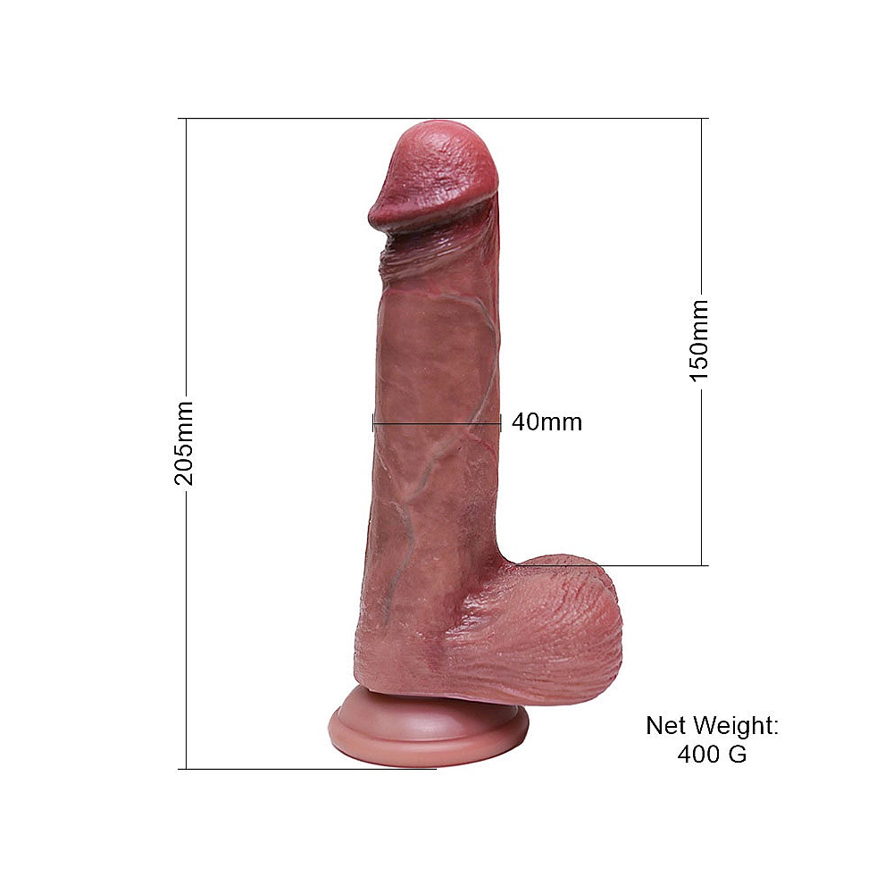 Dildo cu aspect realistic confectionat din silicon cu invelis dublu, rigid la interior si moale la exterior, ce intruchipeaza un penis erect, prevazut cu gland definit, vene in relief si testicule. Pentru o utilizare fara maini, baza este prevazuta cu o cupa de suctiune ce adera la orice suprafata plana.