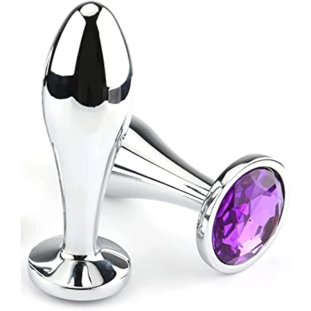 Dildo metalic pentru stimulare anala prevazut cu baza circulara, practica, care este decorata cu o piatra.