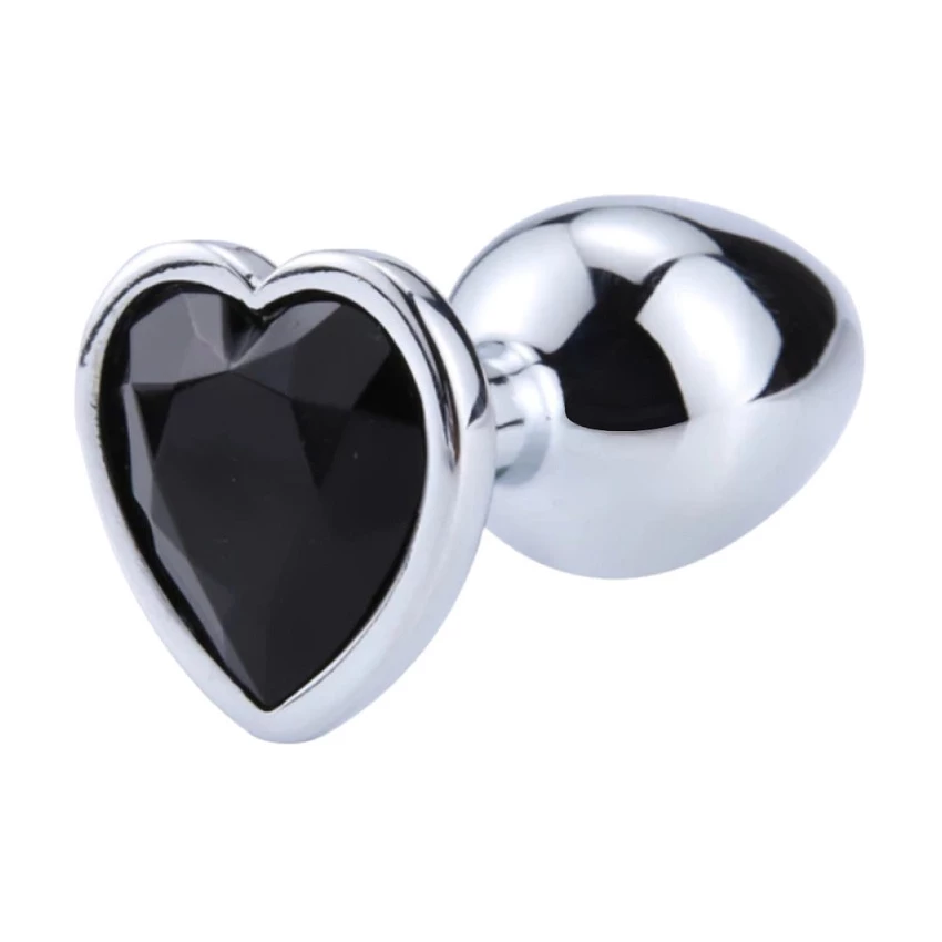 Dildo anal metalic cu suprafata neteda si forma conica. Manerul in forma de inima este decorat cu piatra neagra. Are o greutate de 160g.