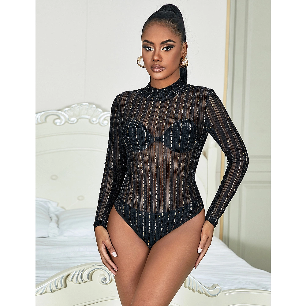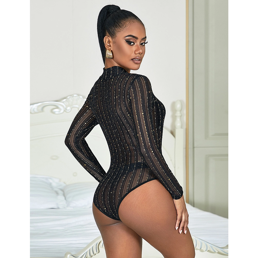 Body cu design clasic fabricat din material textil cu imprimeu cu dungi, prevazut cu maneci lungi si guler la baza gatului. Dungile verticale aurii alungesc optic silueta si adauga o nota de glamour tinutei.