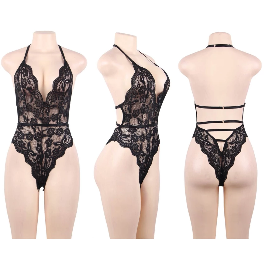 Body din material dantelat cu motiv floral, prevazut cu decolteu adanc in V si decupaj amplu la spate. Este prevazut cu bretele elastice, pentru o potrivire perfecta pe corp.
