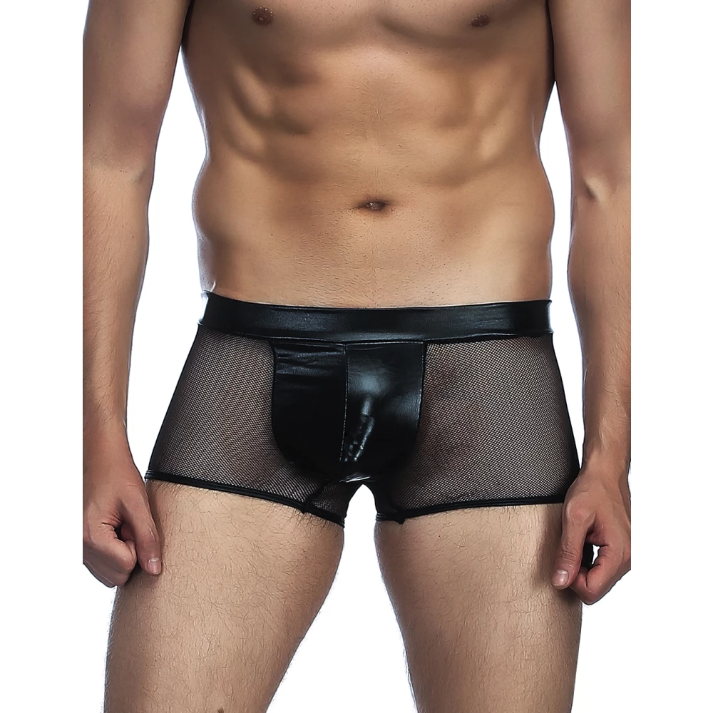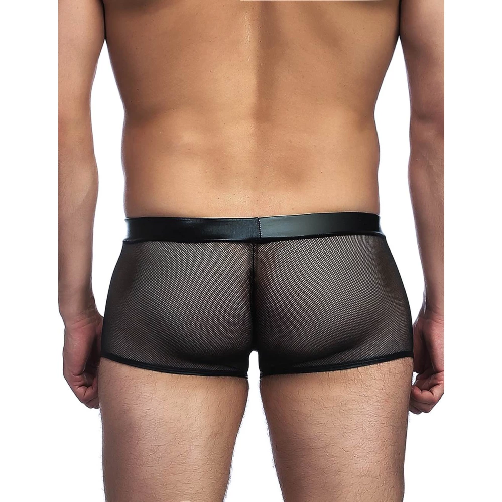 Boxeri negri pentru barbati, realizati din material transparent tip plasa cu ochiuri mici. Model cu detalii din material cu aspect lucios.
