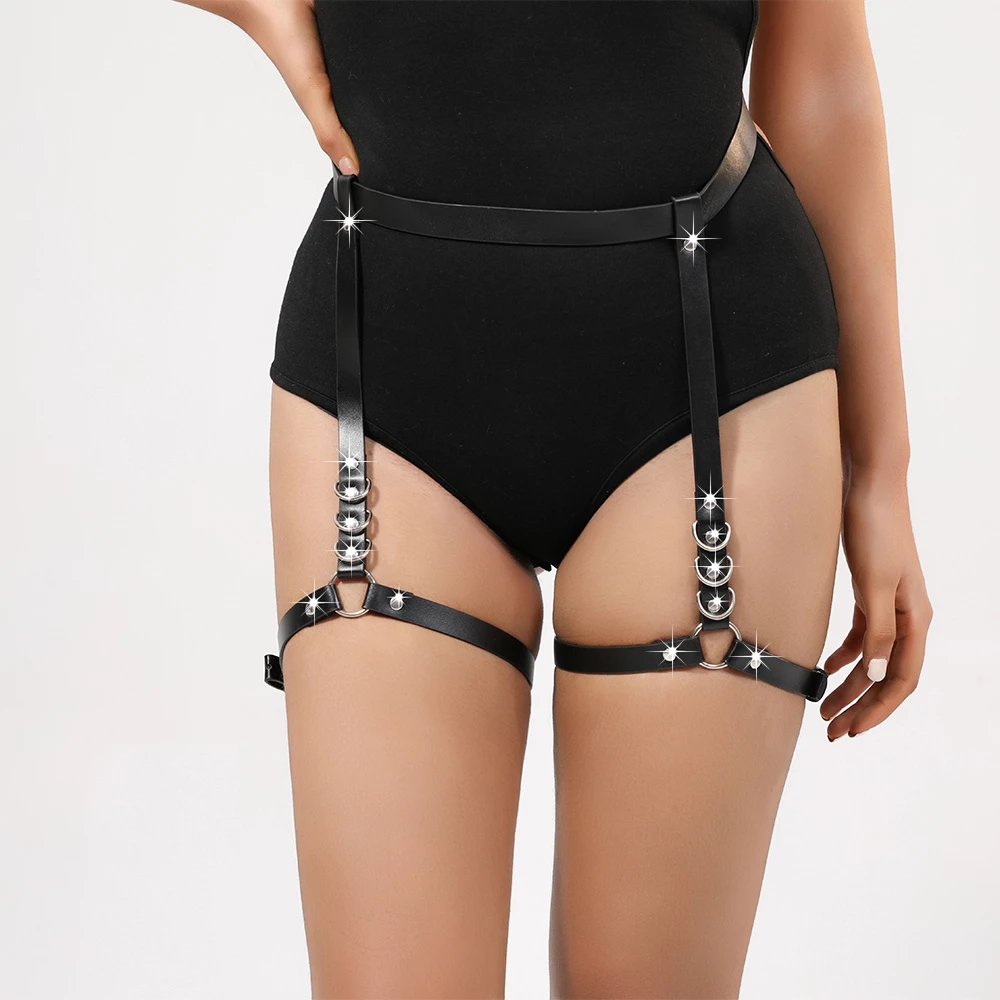 Portjartier ideal pentru a completa o tinuta bondage, realizat din cureluse inguste din piele sintetica. Este prevazut cu jartiere reglabile in circumferinta, pentru a fi fixate cu usurinta pe picior. De asemenea, este accesorizat cu elemente metalice in forma de inele.
