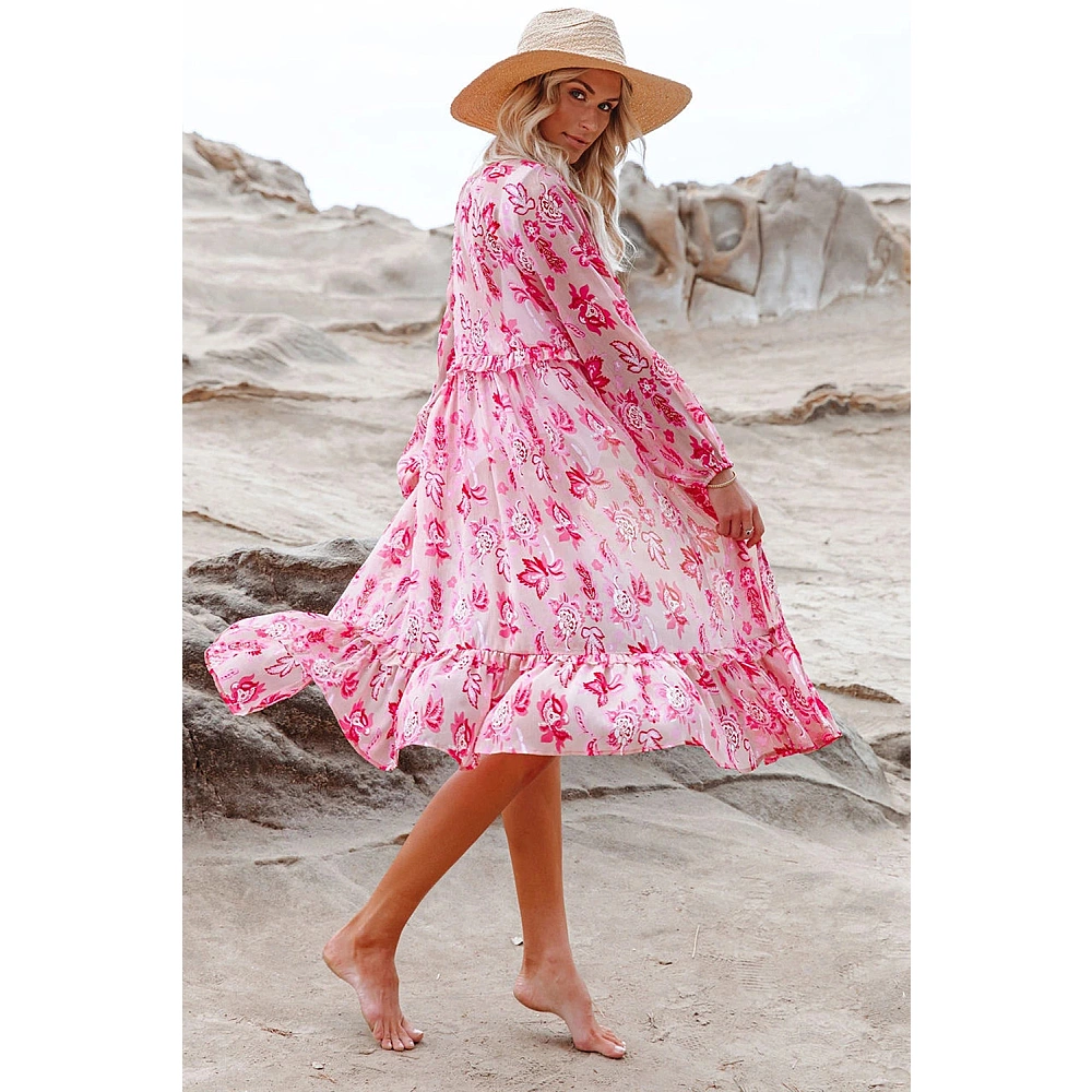 Rochie inflorata pentru plaja prevazuta cu snur ingust in talie si maneci lungi. Usoara si vaporoasa, este potrivita pentru a fi purtata peste un costum de baie sau o tinuta lejera de vara.
