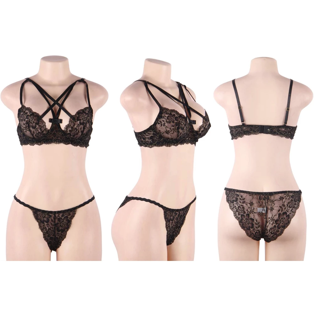 Set de lenjerie erotica format din sutien si slip. Setul este realizat din material transparent cu aspect de dantela, care confera o nota de eleganta designului.