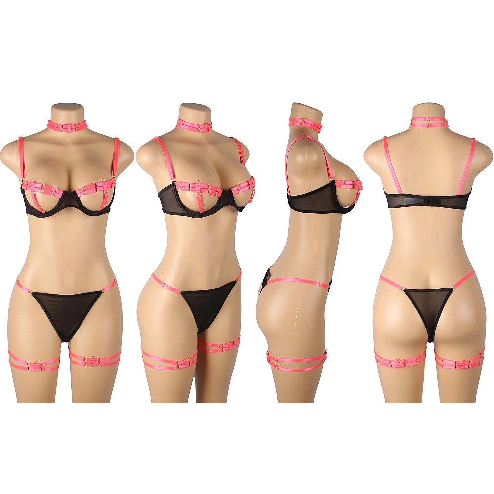 Set sexy compus din sutien, slip tanga, chocker si jartiere duble pentru picioare.