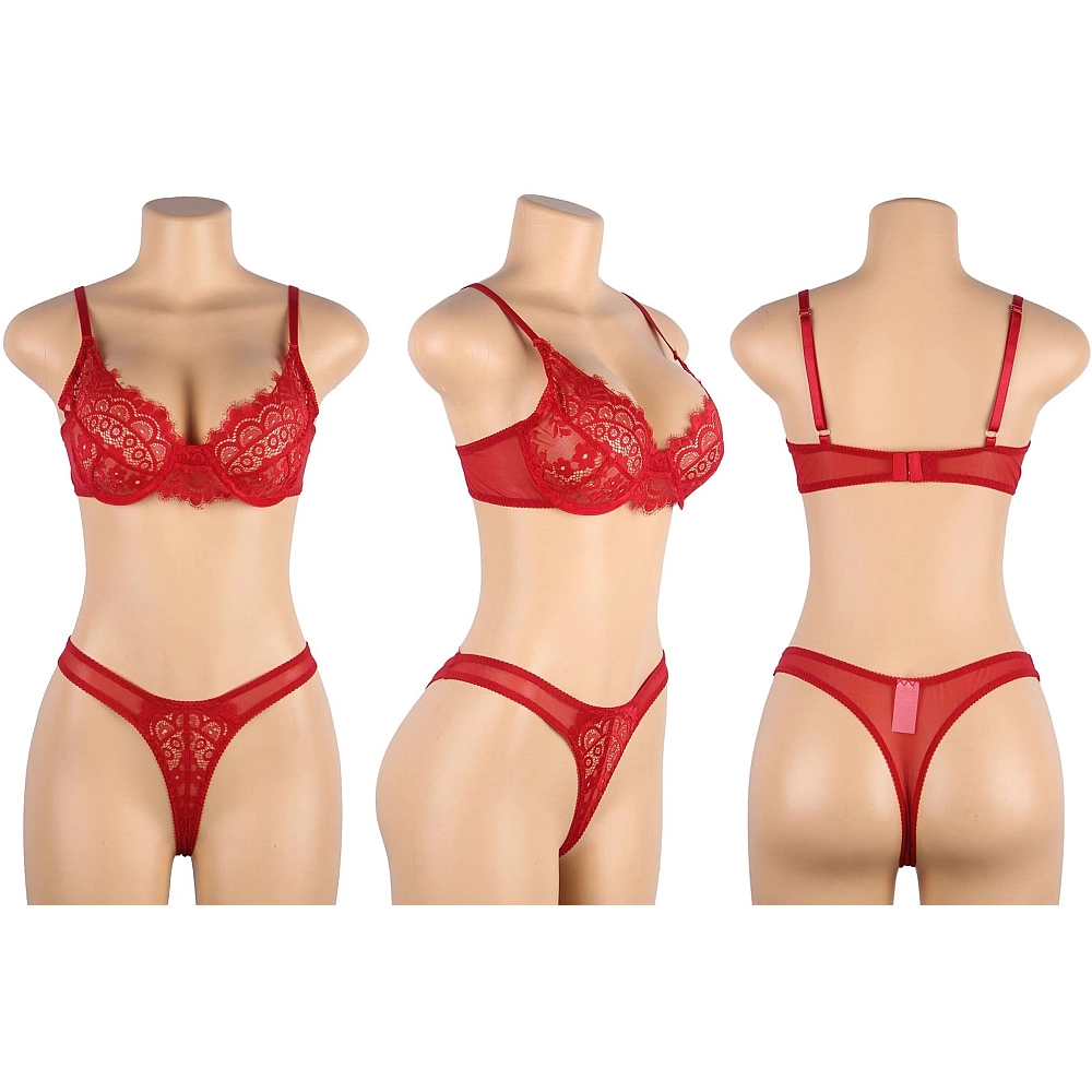 Set de lenjerie intima fabricat din material dantelat, format din sutien si slip tanga.