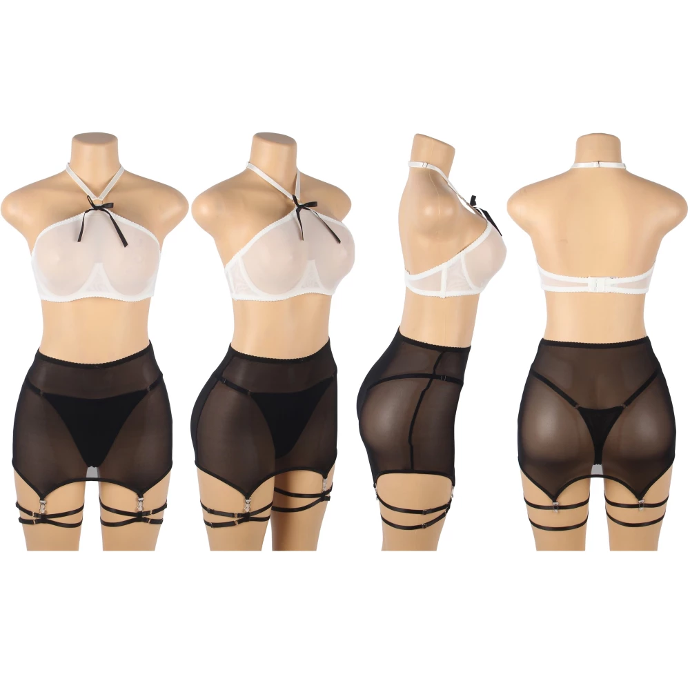 Set de lenjerie sexy compus din top cu prindere dupa gat, fusta mini, slip tanga si jartiere duble pentru picioare.