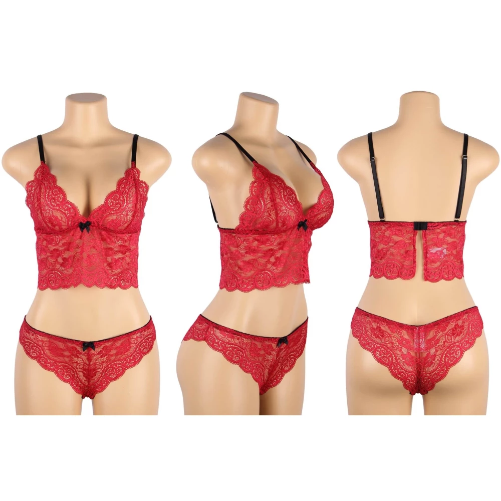 Set de lenjerie compus din 3 piese: un top din dantela prevazut cu bretele reglabile, un slip asortat si un pantalon scurt din material satinat.