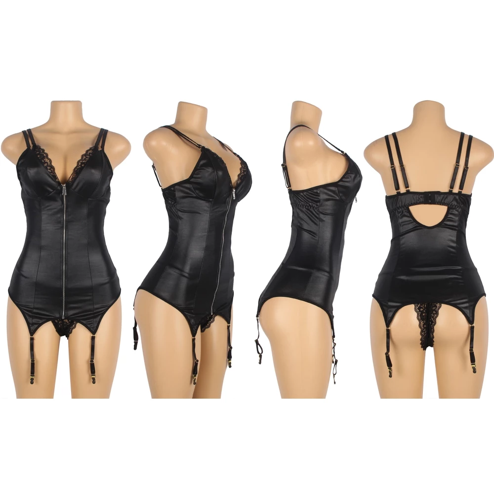 Topul este realizat din material lucios cu aspect umed, prevazut cu bretele si jartiere reglabile si sistem frontal de inchidere pe baza de fermoar. Slipul este fabricat din material dantelat si vine in completarea detaliilor de pe decolteu.