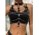 Top cu aspect fetish compus din cureluse inguste din piele sintetica, unite intre ele prin inele si lantisoare metalice. Design fara cupe, dispune de sistem de reglare si prindere la spate pe baza de catarama si capsa.