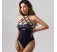 Top bondage, realizat din piele sintetica. In partea frontala cureluse inguste sunt unite intre ele formand un model geometric. Elementele metalice intregesc aspectul bondage. Model prevazut cu guler . Dispune de sistem de prindere dupa gat si la spate.