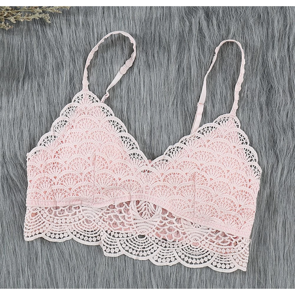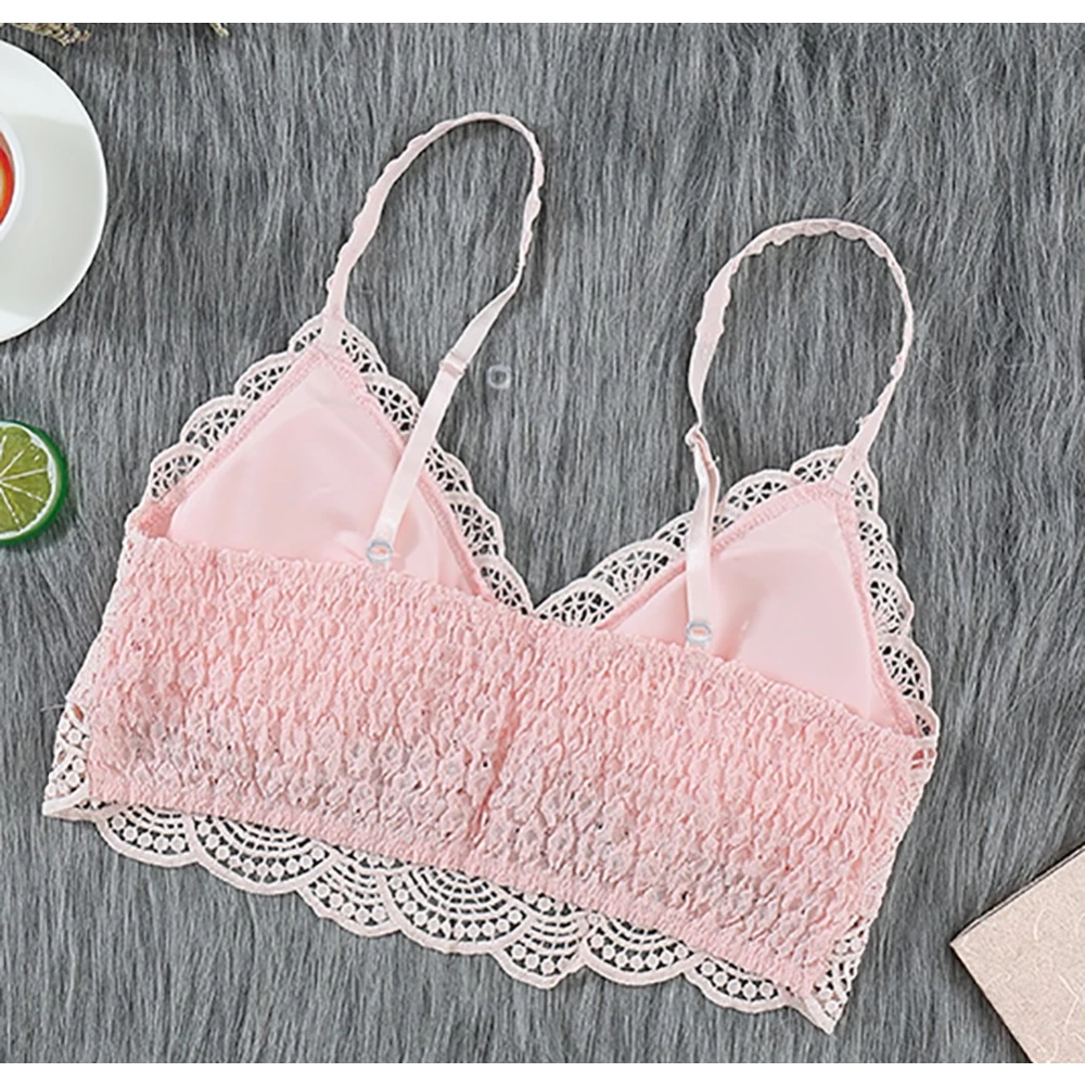 Sutien tip bralette fabricat din dantela feminina cu model floral, prevazut cu decolteu adanc in V. Dispune de bretele reglabile, cupe moi captusite si margini festonate.