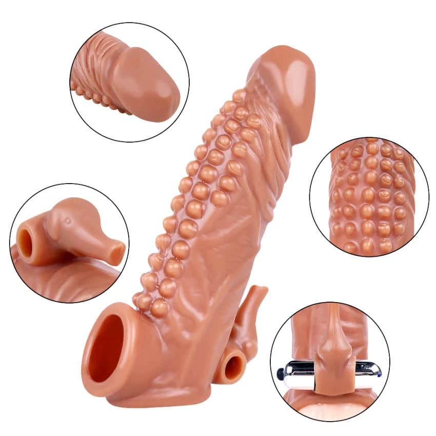 Extensie cu vibratii pentru penis, confectionata din material elastic si matasos ce se simte extrem de placut la atingere. Design-ul este prevazut cu gland proeminent si multiple forme sferice in relief pentru stimularea cat mai intensa a partenerei.
