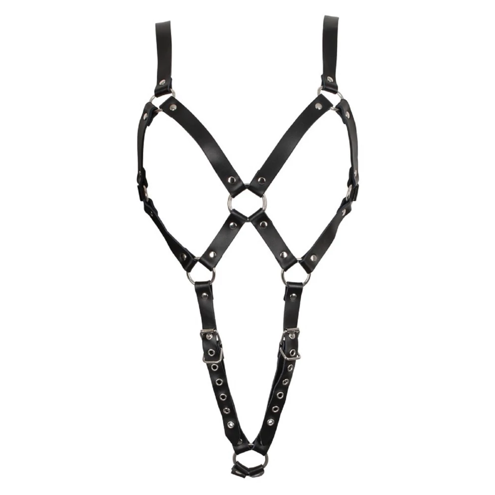 Ham fabricat din piele, prevazut cu curele ajustabile, tinte si aplicatii metalice.