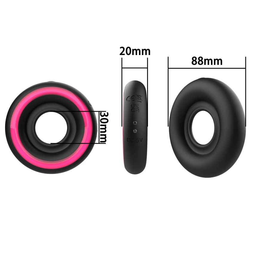 Inel cu vibratii pentru penis, realizat preponderent din silicon, un material de inalta calitate, foarte fin si matasos la atingere. Culorile articolului sunt un mix elegant si totodata jucaus intre nuanta clasica de negru si insertia jucausa de roz intens. Totodata, aspectul ludic si inovator al inelului este dat de prezenta luminii ambientale pe baza de LED, inclusa in materialul interior.