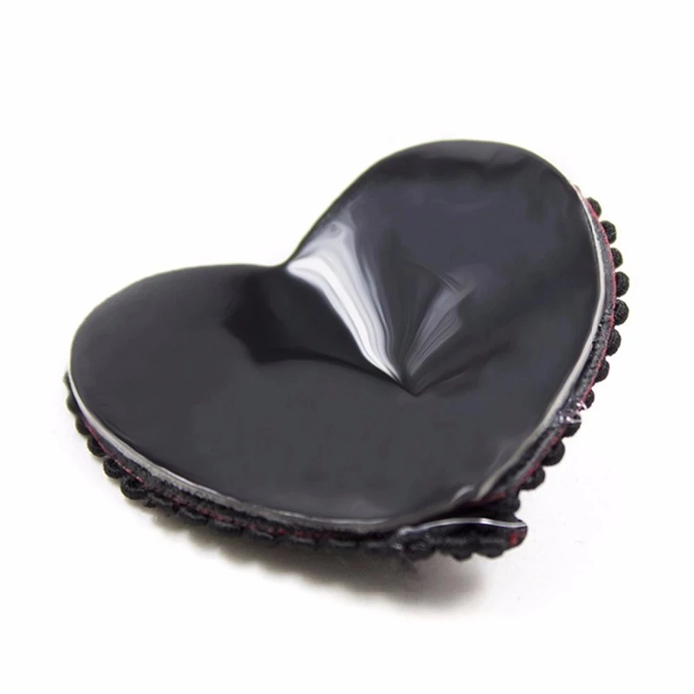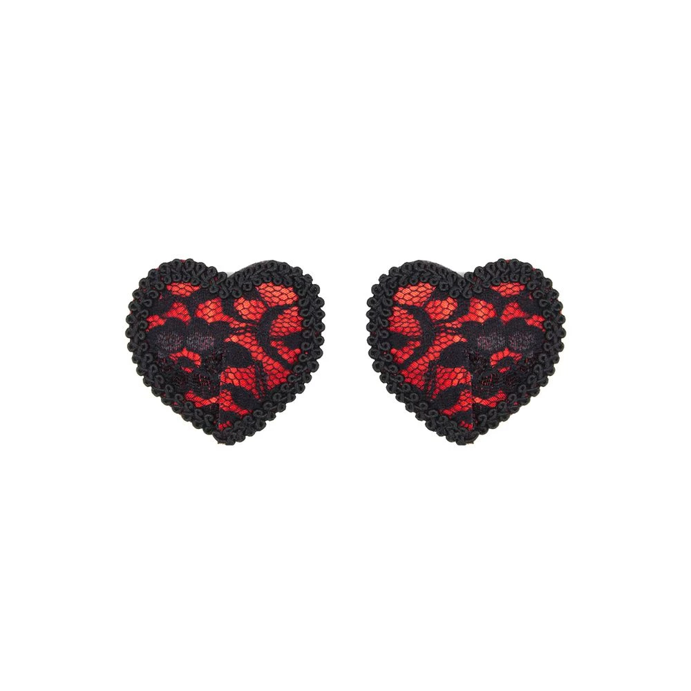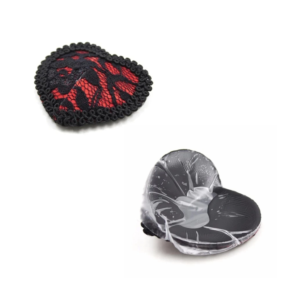Decoratiuni pentru sfarcuri in forma inimioara, cu baza rosie acoperita cu dantela neagra transparenta.