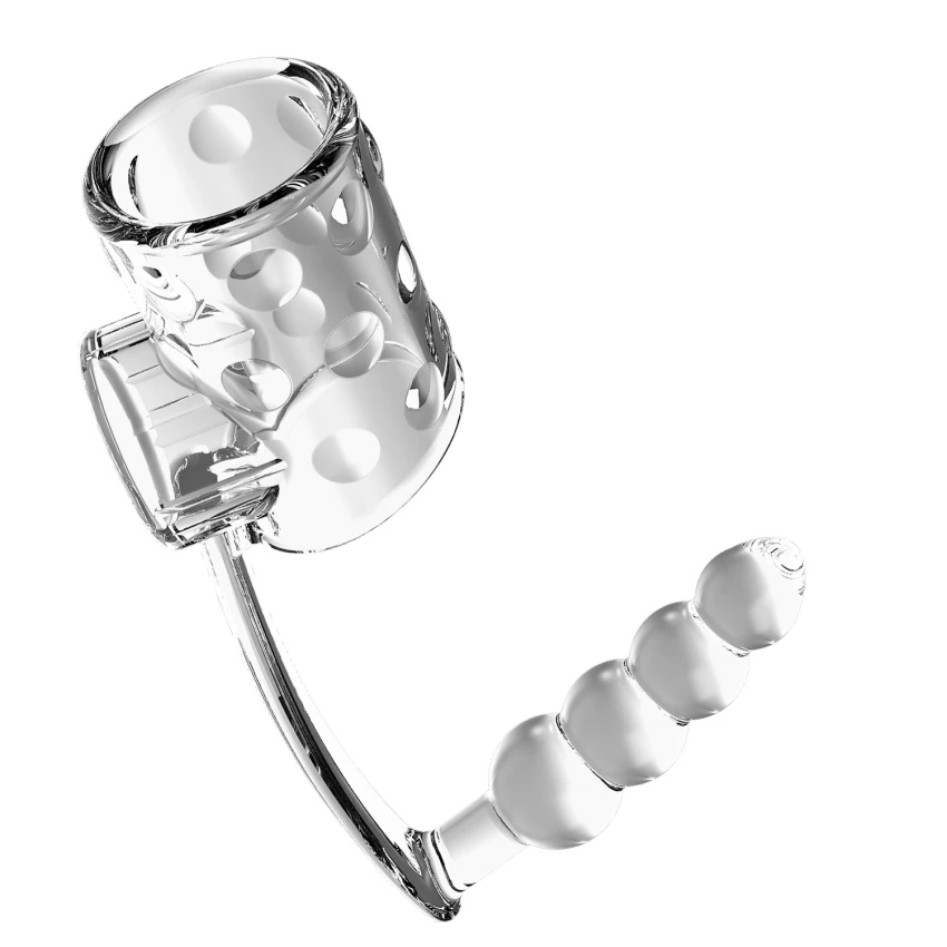 Manson dublu pentru penis si testicule, confectionat din material moale si matasos, care se simte fin si placut la atingere. Design-ul este unul transparent si este prevazut cu un atasament sub forma de dildo anal, realizat din acelasi material catifelat. Accesoriul anal se aseamana cu un sirag de bile graduale, oferind astfel un confort sporit la inserarea lui.