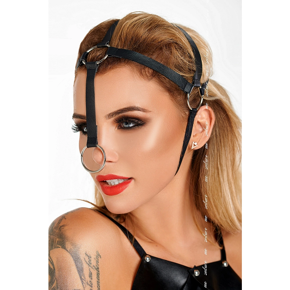 Accesoriu fetish pentru cap, din cureluse inguste conectate intre ele prin inele metalice.