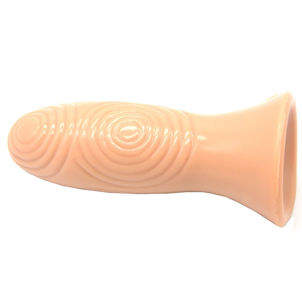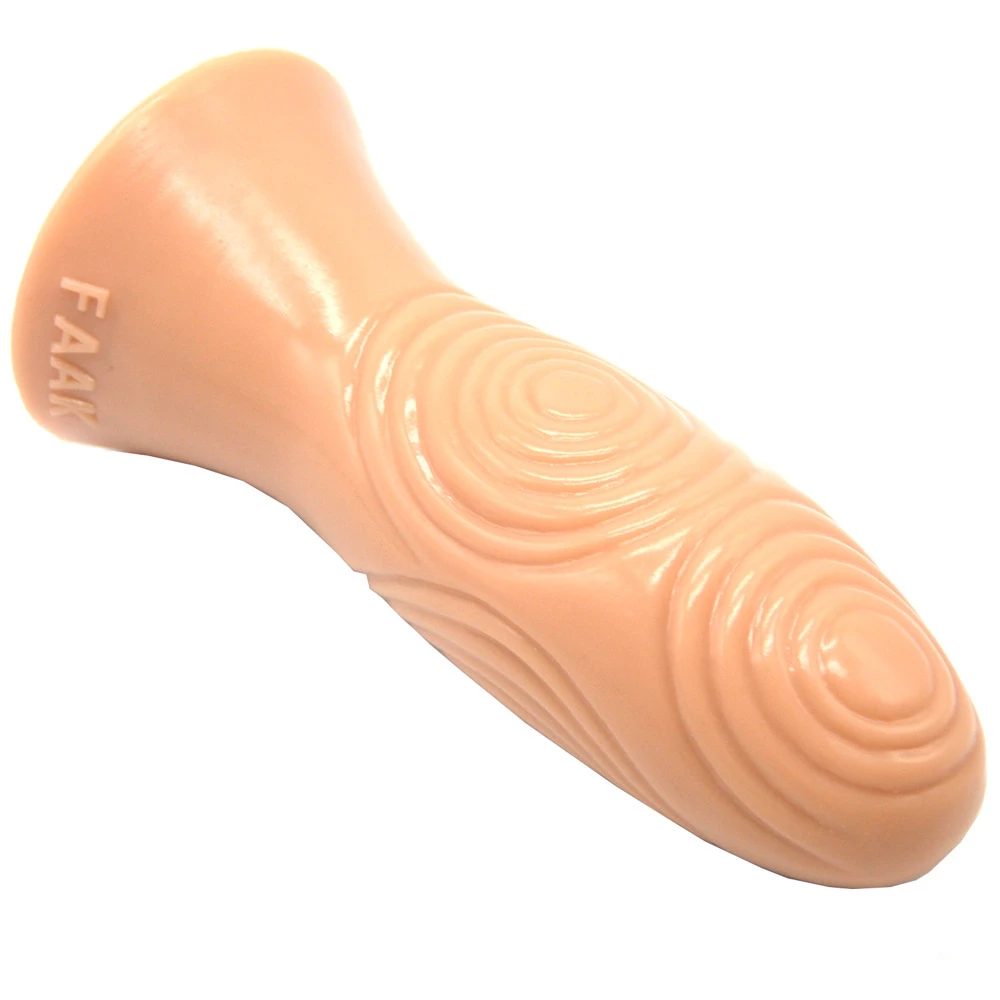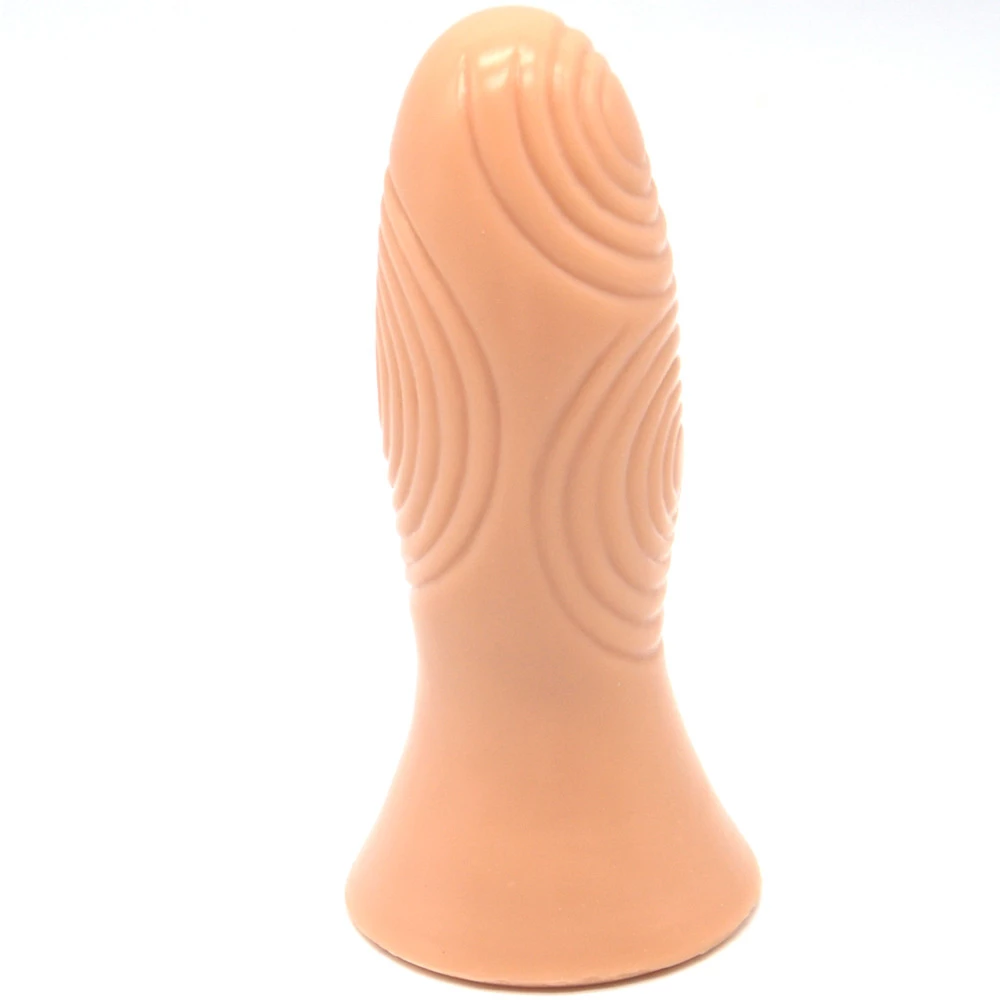 Dildo cu forma conica realizat din silicon cu suprafata neteda si lucioasa si texturi circulare stimulatoare.