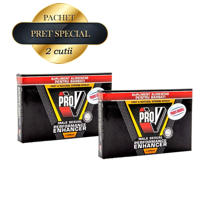 Pachet promotional ce contine 2 cutii de pilule pentru potenta Pro V 4. Acestea reprezinta un tonic sexual special creat pentru barbati, ce ajuta la imbunatatirea actului sexual, a functiilor sexuale dar si la obtinerea si mentinerea unei erectii ferme mai mult timp.