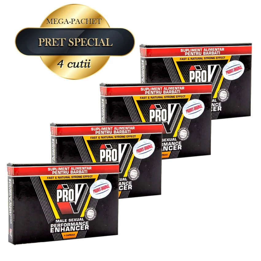 Pachet promotional ce contine 4 cutii de pilule pentru potenta Pro V 4. Acestea reprezinta un tonic sexual special creat pentru barbati, ce ajuta la imbunatatirea actului sexual, a functiilor sexuale dar si la obtinerea si mentinerea unei erectii ferme mai mult timp.