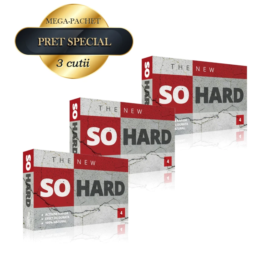Se recomanda administrarea de So Hard pe o perioada mai indelungata pentru ca acesta sa va poate ajuta in cazuri de disfunctie erectila, mentinand crescuta dorinta sexuala si obtinand performante sexuale optime. Pachetul include 3 cutii a cate 4 pilule fiecare.