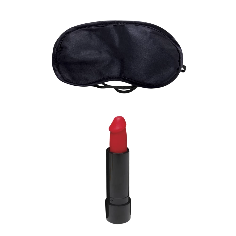 Setul include masca pentru ochi, poster Kiss My si ruj in forma de penis.