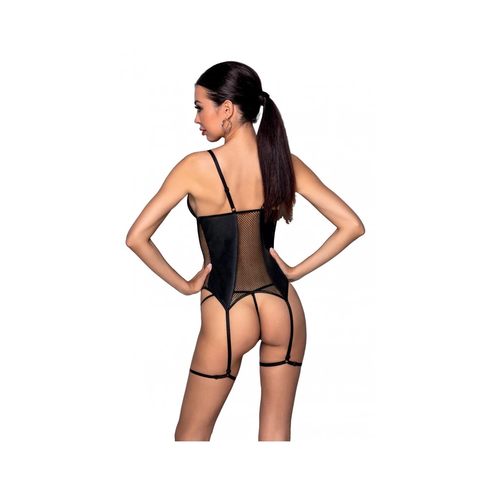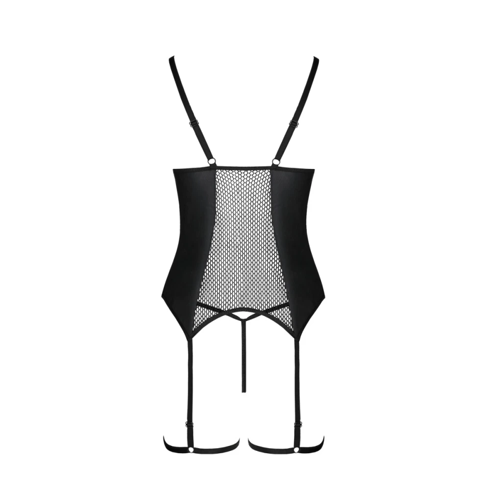 Corset sexy confectionat din material elastic tip plasa cu ochiuri mici si insertii din material cu aspect lucios, prevazut cu slip tanga asortat si jartiere fixe pentru picior. Dispune de bretele si jartiere reglabile. Are sistem de prindere frontal, pe baza de snur, iar zona bustului este accesorizata cu accente metalice.