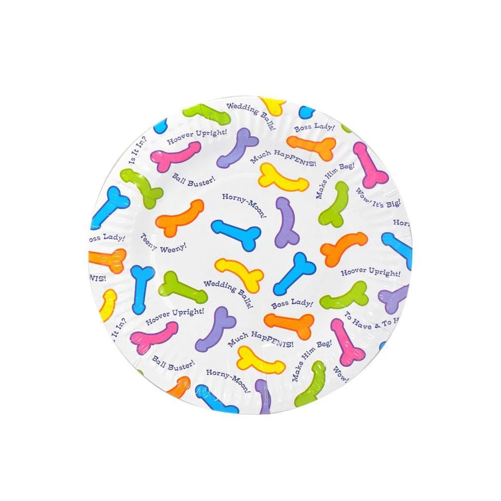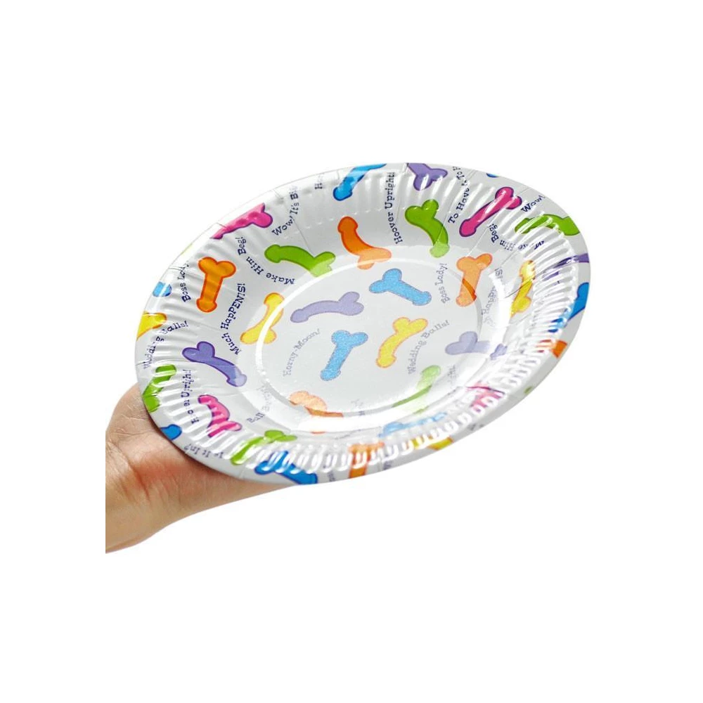 Farfurii pentru petrecere, cu desene colorate sub forma de mini penisuri.