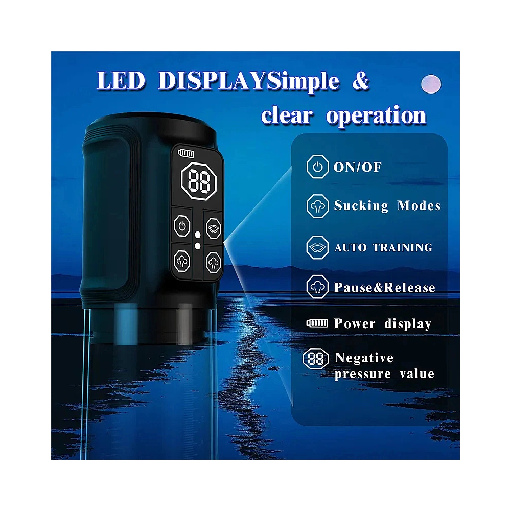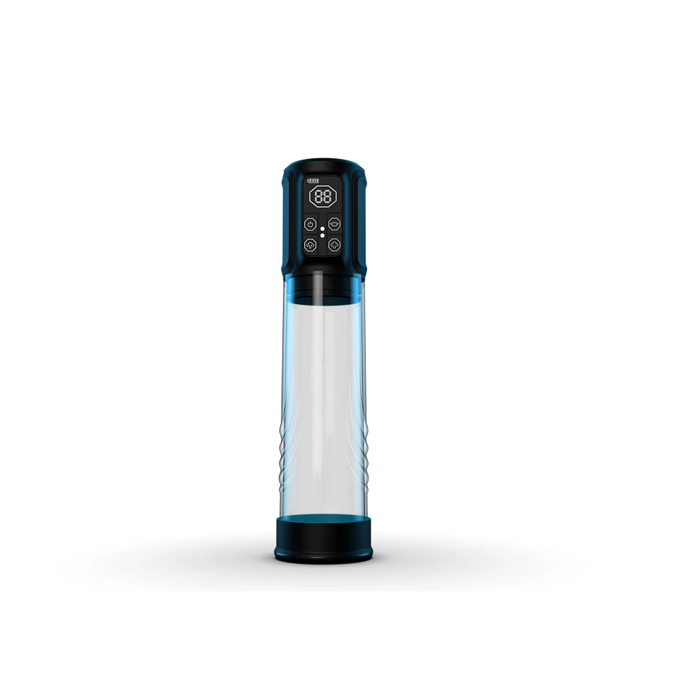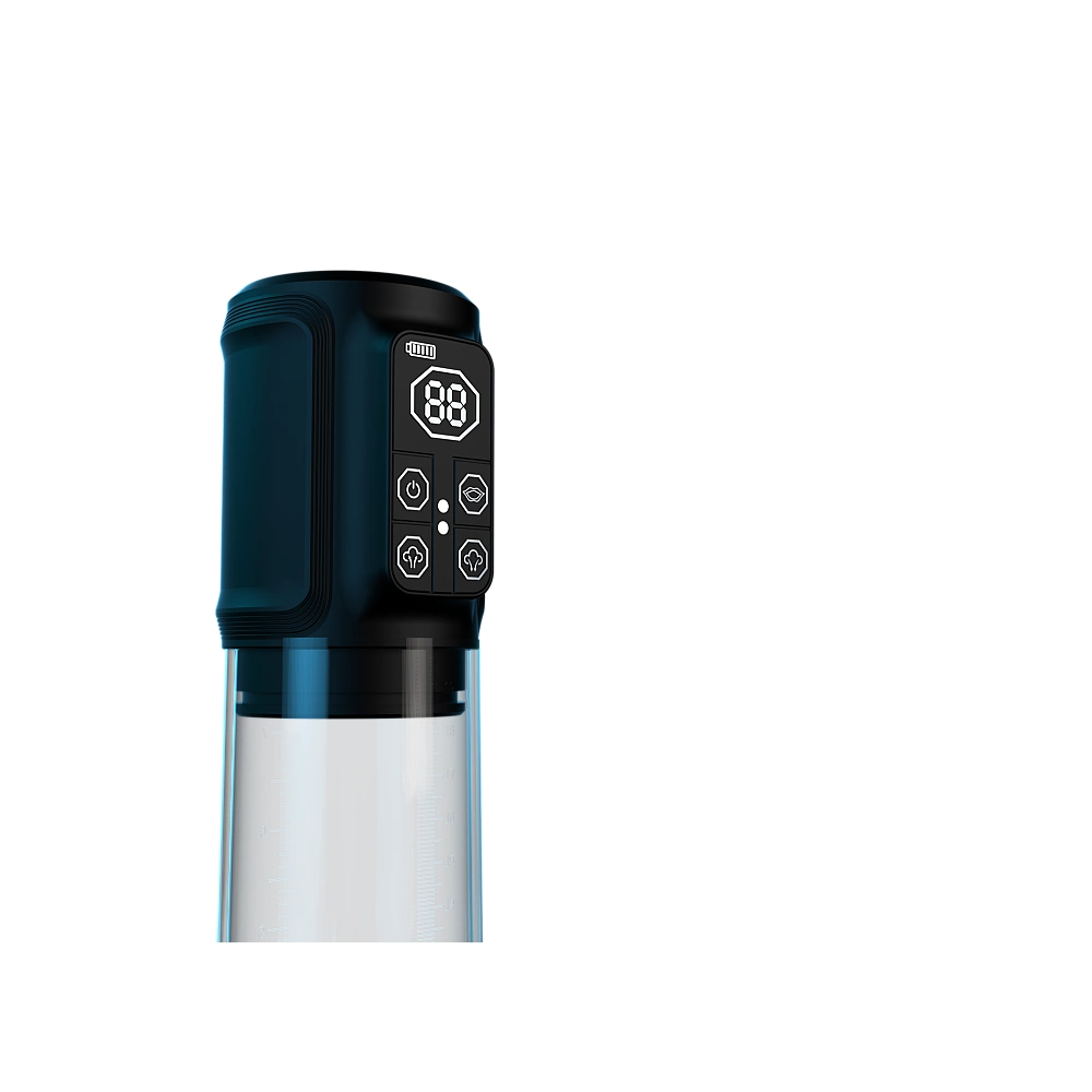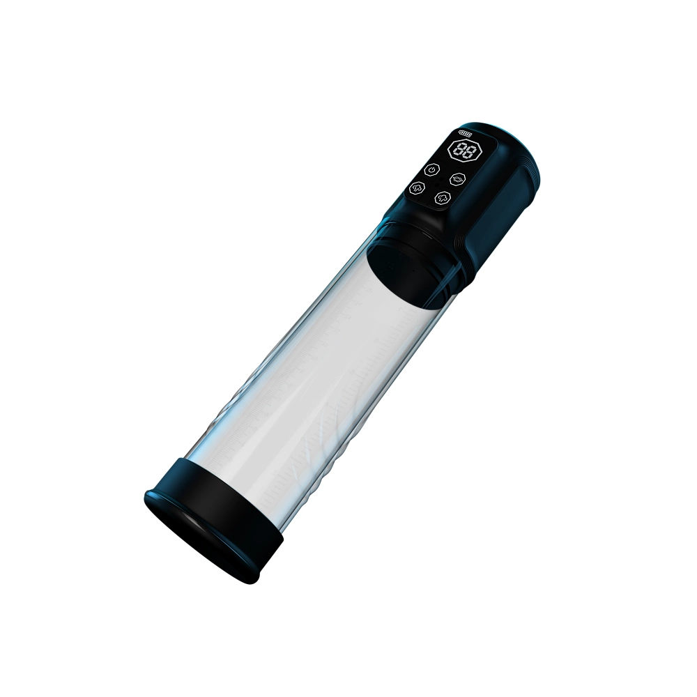 Pompa automata pentru penis, prevazuta cu cilindru transparent gradat si 2 mansoane din material moale si elastic. Dispune de diverse niveluri de suctiune ce se actioneaza din panoul de comanda evidentiat din partea de sus.