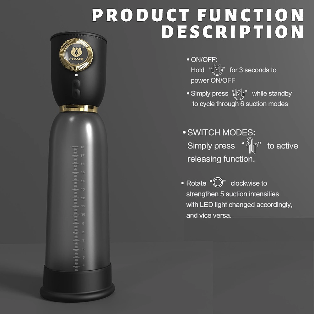 Pompa electrica pentru penis prevazuta cu cilindru transparent si manson moale din silicon. Este dotata cu 5 frecvente de suctiune care pot fi accesate din panoul de comanda amplasat la indemana.