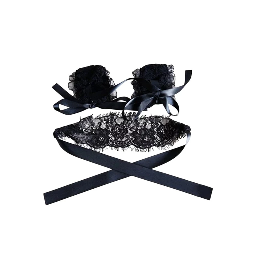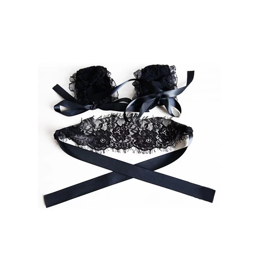 Set fetish confectionat din material fin, dantelat, compus din masca pentru ochi si catuse pentru maini. Aduce un plus incitant momentelor erotice in doi.