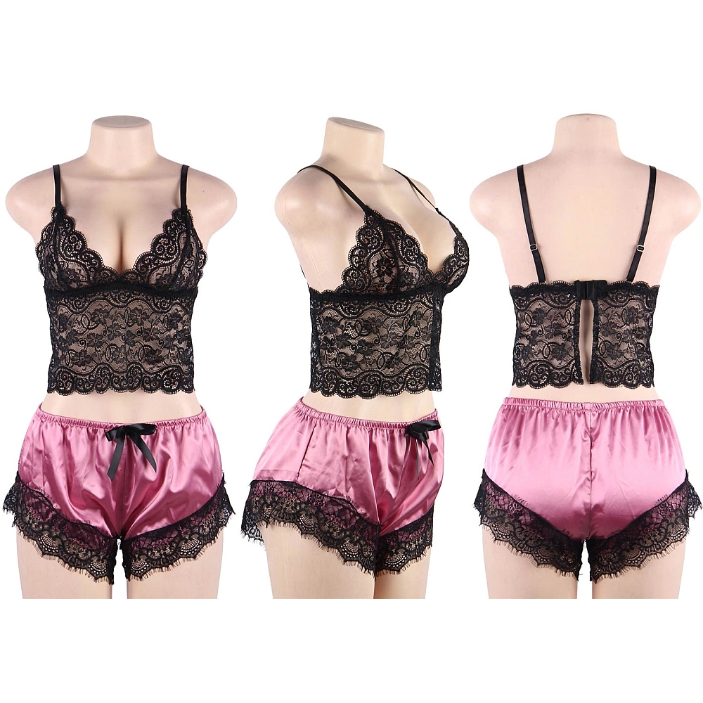 Set de lenjerie erotica rafinat, sub forma de pijama, compus din top si pantaloni scurti cu design sexy si incitant. Este realizat din dantela fina cu insertii de modele florale dispuse pe intreaga suprafata si satin delicat de culoare roz.