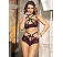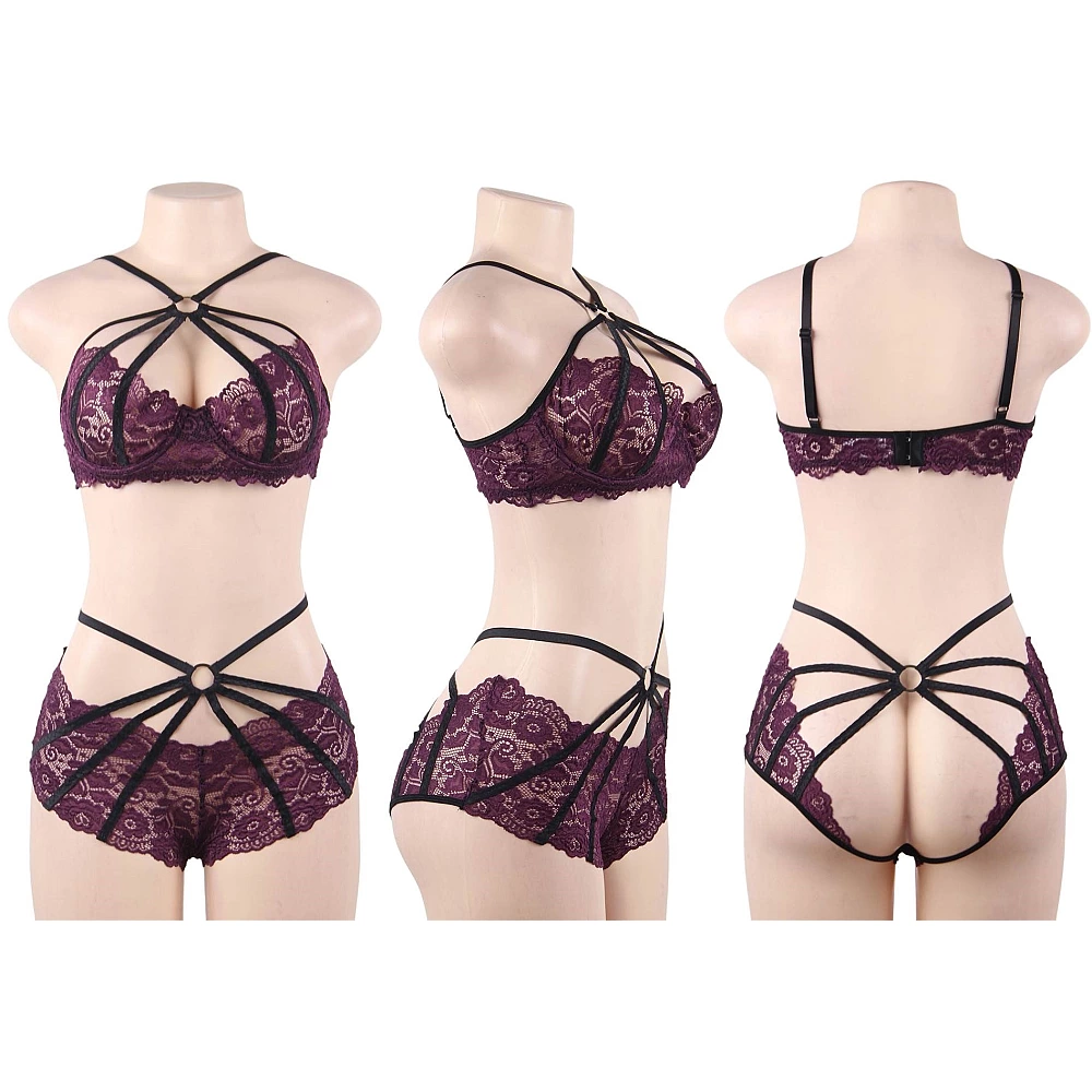 Set de lenjerie intima cu design provocator, fabricat din material dantelat. Dantela adauga o nota de rafinament si feminitate, in timp ce benzile negre aduc setul in zona moderna.
